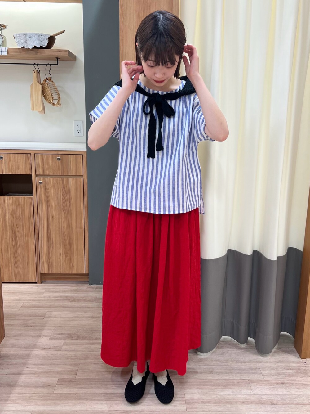 赤 × 青 × 黒 の珍しい組み合わせの夏code⸜🍍⸝ ふわりと広がるボリューム感が可愛いスカートは ウエストゴム仕様×柔らかい生地感なので 真夏でも涼しく履けるところが🙆🏻⸝⋆