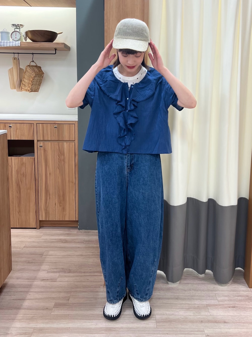 青×白の夏のカジュアルcode🦋💎𓂃 𓈒𓏸 フリルが華やかな印象なブラウスは 楊柳生地を使用してあるので 洗濯時のシワ感が目立ちにくく、 ゆったりシルエットで着心地も🙆🏻♂️🙆🏻⸝⋆ 今回はトップスの色に合わせたデニムパンツと ボタンを1つあけて水玉tシャツをチラ見せした 個人的にしっくりきたcodeにしてみましたᝰ✍🏻✩꙳