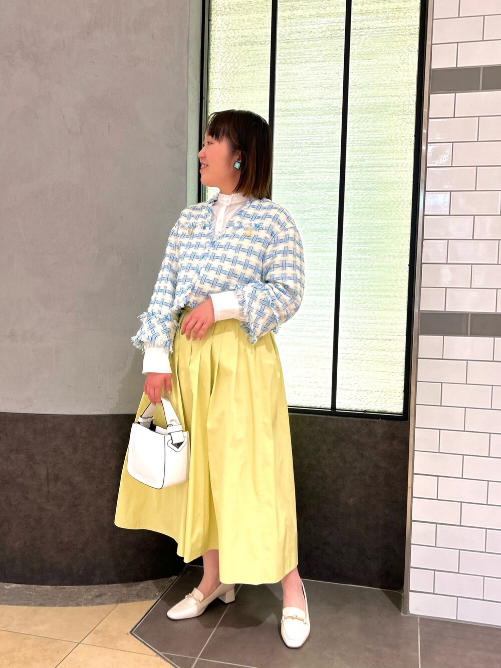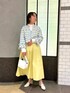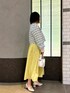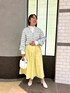 爽やかな配色のツイードジャケットはトレンドのショート丈で、ハイウエストのボトムやワンピースと相性抜群 人気リバーシブルスカートの新色イエローと合わせて春の爽やかお出かけコーデに◎ 衿と袖口のフリルが可愛いシャツはインナーとしても1枚着でも使いやすい万能アイテムです [着用サイズ] ジャケット:38 シャツ:38 スカート:2