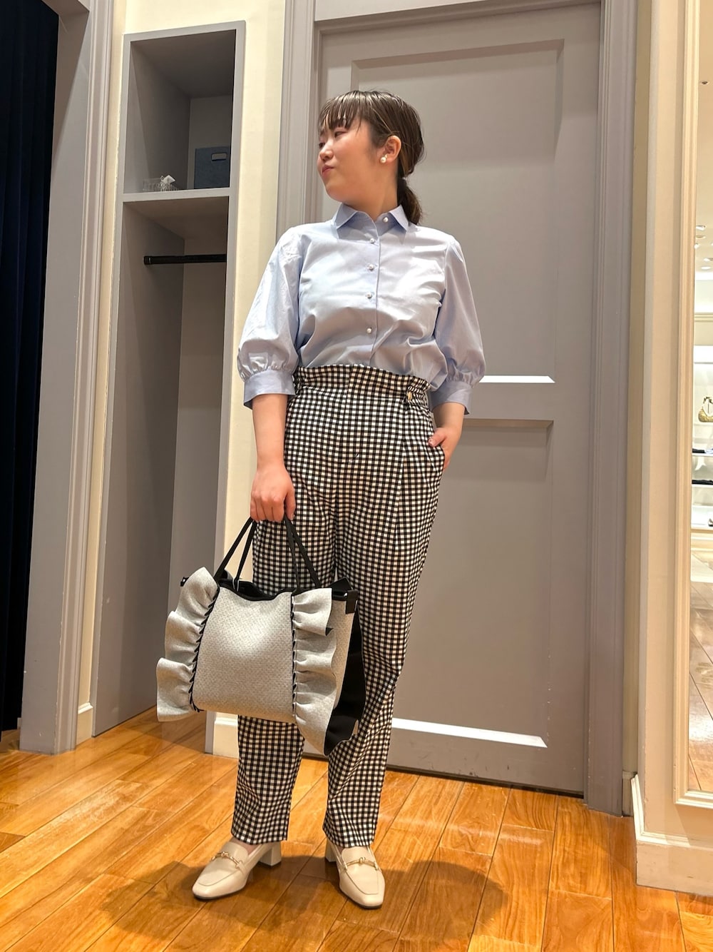 パールボタンとパフスリーブが可愛いシャツは、程よいハリ感でボリュームが出過ぎないのが嬉しいポイント ウォッシャブル&ストレッチできれいなシルエットを演出してくれるストレートパンツと合わせて楽ちんオフィスカジュアルに パンツはウエスト部分をボタンで調整できますが、少し大きめなので1つ下のサイズでも◎ フリルがアクセントのトートバッグはとにかく軽いのでデイリー使いにオススメです! [着用サイズ] シャツ:38 パンツ:38