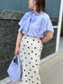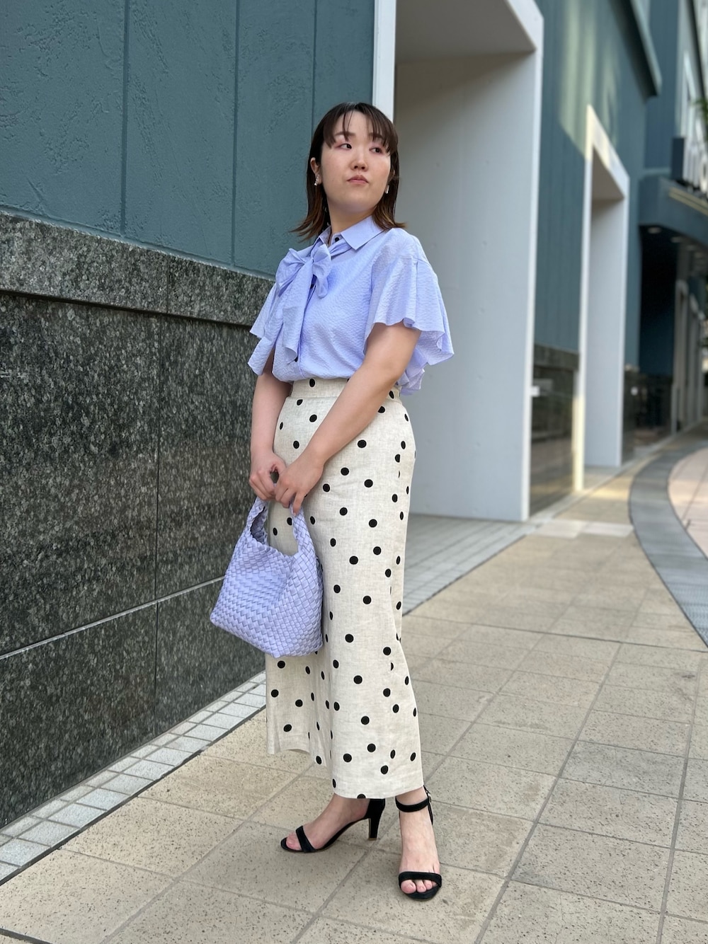 ふんわりリボンとラッフル袖が可愛いブラウスはとにかく柔らかくて軽い着心地が特徴 程よくゆったりしたシルエットなので、これからの暑い季節にも涼しく着ていただけます 二の腕を隠してくれるのも嬉しいポイント(着てみたらすごく細見えしました◎) 麻混素材を使用したドットスカートは甘くなりすぎないタイトなシルエット、Tシャツやニットでカジュアルに着るのもオススメです 店頭でも人気のメッシュバッグはコーディネートのアクセントにピッタリ◎ 底に中敷が入っているのでしっかり自立する優れ物です(長財布入ります!) [着用サイズ] ブラウス:38 スカート:38