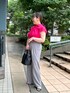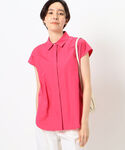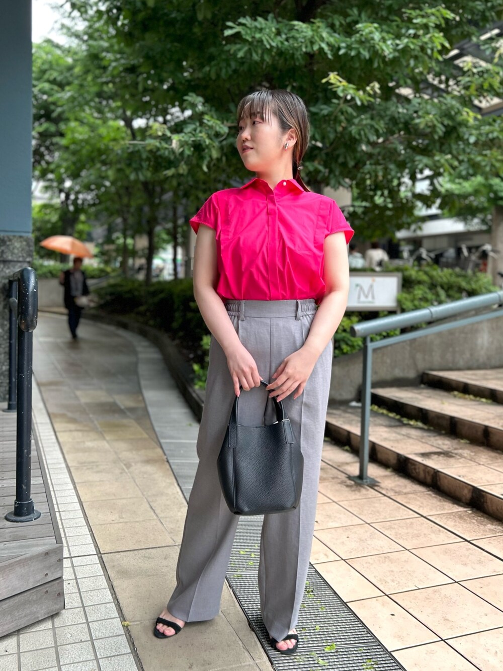 鮮やかなピンクが目を惹く半袖シャツは、タックが入っているのでキレイなシルエットを演出してくれます 肩周りをしっかり隠してくれる袖丈なのが安心ポイント 合わせているワイドパンツは店頭でもかなり人気のおすすめアイテム! サラッと涼しく柔らかい素材で履き心地も抜群◎ シワに強くウォッシャブルなのでデイリー使いにピッタリです 158cmで38サイズは引きずる位の丈感、ヒール合わせが◎ 暑くなってきたのでリーフデザインのバレッタで髪をまとめてスッキリコーデにしてみました [着用サイズ] シャツ:38 パンツ:38