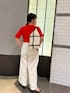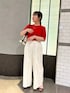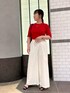 鮮やかな赤が目を惹くリブトップスは、程よい肉感と柔らかさで着心地バツグン! 楽チンなのに身体のラインを綺麗に見せてくれる万能アイテムです スカート風のワイドパンツはウォッシャブル&防シワ&速乾の高機能! 裏地無しでも透け感を気にせず履いていただけるので、暑い日でも快適です◎ ウエストゴムでかなりゆとりがあるので普段の1つ下のサイズもオススメ(丈も長めで、158cmで36サイズが裾ギリギリでした) キレイめアクセサリーや小物で大人のキチンとカジュアルスタイルに [着用サイズ] カットソー:F パンツ:36