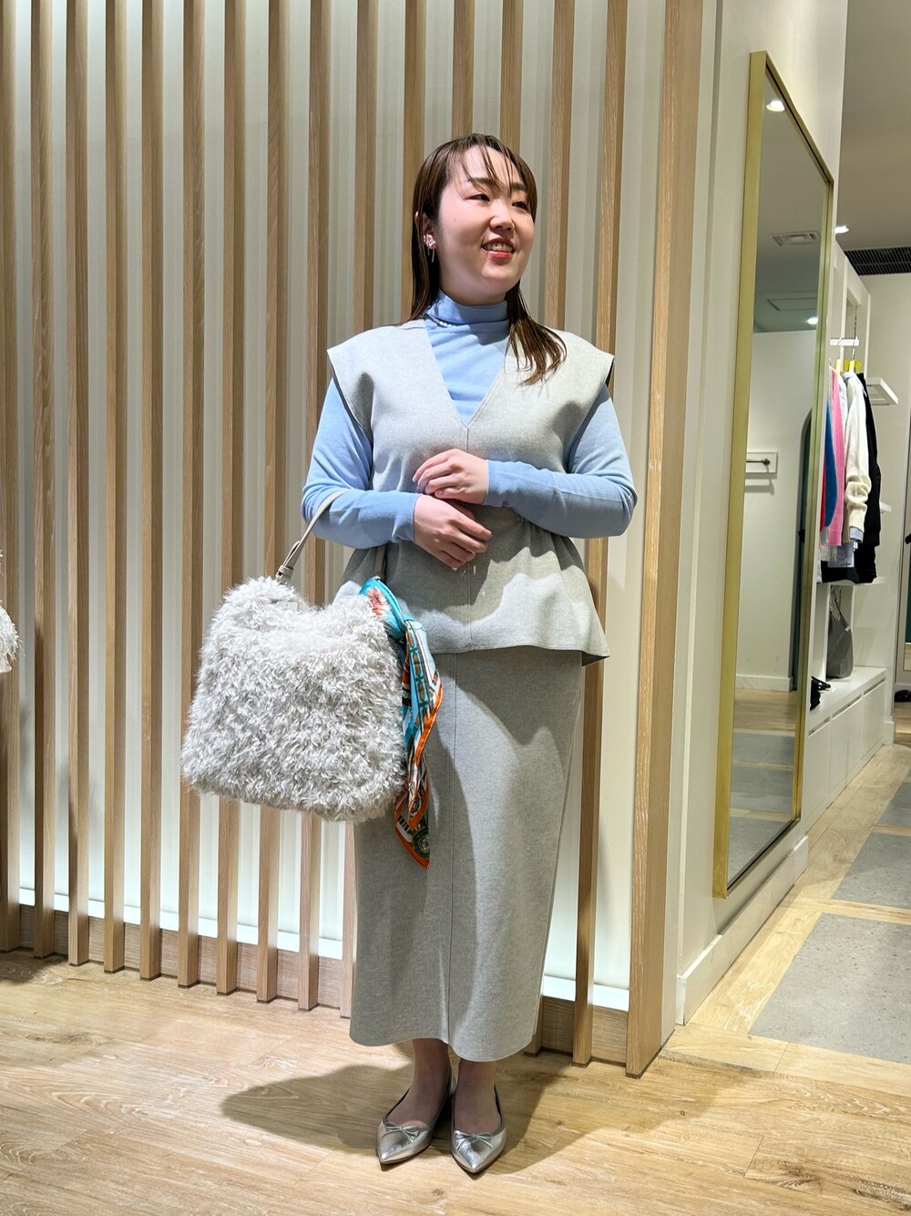 体型カバーとオシャレ見えを兼ね備えたセットアップならこちら! ライトグレーがすっきりした印象のベスト+タイトスカートは、Wジャージ素材でストレッチが効いていて着心地抜群 ベストはウエスト内側にドローコードが付いているので、絞ってシルエットを調節できます◎ (個人的には絞った方がスッキリ見えておすすめ) またドローコードのアジャスターは収納可能! コーデのテイストに合わせで出し入れできます スカートもタイトながらストレッチと後ろスリットで脚の可動域は問題なし◎ ベーシックなシルエットなので着回ししやすいアイテムです [着用サイズ] ベスト:38 スカート:38 ニット:38