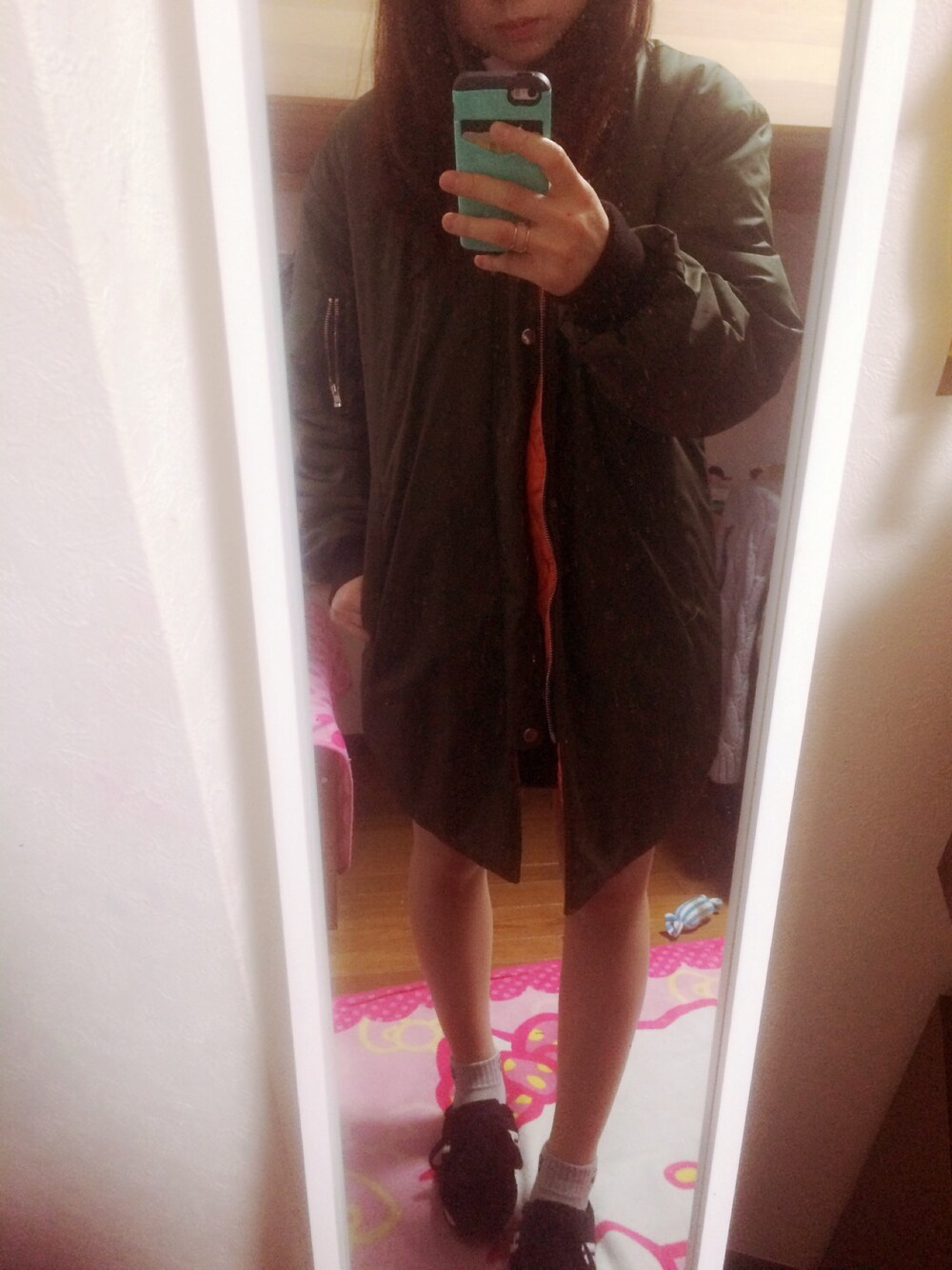 みんな持ってるカーキのブルゾンだけど、ロング丈ってとこがみんなとかぶらないポイントだと大学で言い張ってます😂(笑)(ベンチコートって馬鹿にされるけど)
