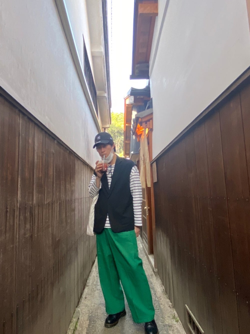 岡山に旅行に行った時に、彼女に撮ってもらった写真です。⚪️×⚫️×🟢の3色コーデになっており、今流行りのジレベストとボーダーTシャツを取り入れてみました。