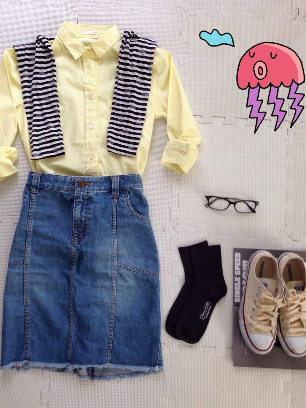 ボーダーカーディガン g.u イエローシャツ マークジェイコブス デニムスカート 付録 グレー靴下 コンバース スニーカー JINS 眼鏡 写真のサイズミス!笑