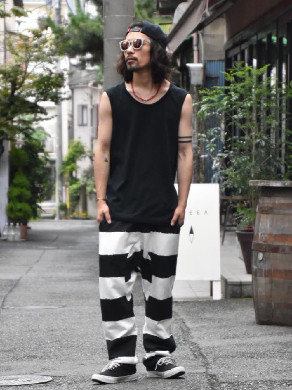 おはようございます。 昨夜はVIRGOデザイナーがVoの バンドCHRONOMETERのLIVEへ。 正直めちゃめちゃカッコよかったです。 興味ある方は是非次回ライブ行きましょう。 前日の冬コーデ先取り紹介から 今日はもろ真夏の着こなし笑 個人的にも気になってた新作の カットオフノースリーブに 定番のボーダースウェットパンツを あわせました。 今日も雨ですので店頭ポイント2倍。 1日ショップにおりますので 遊びに来て下さい^ ^
