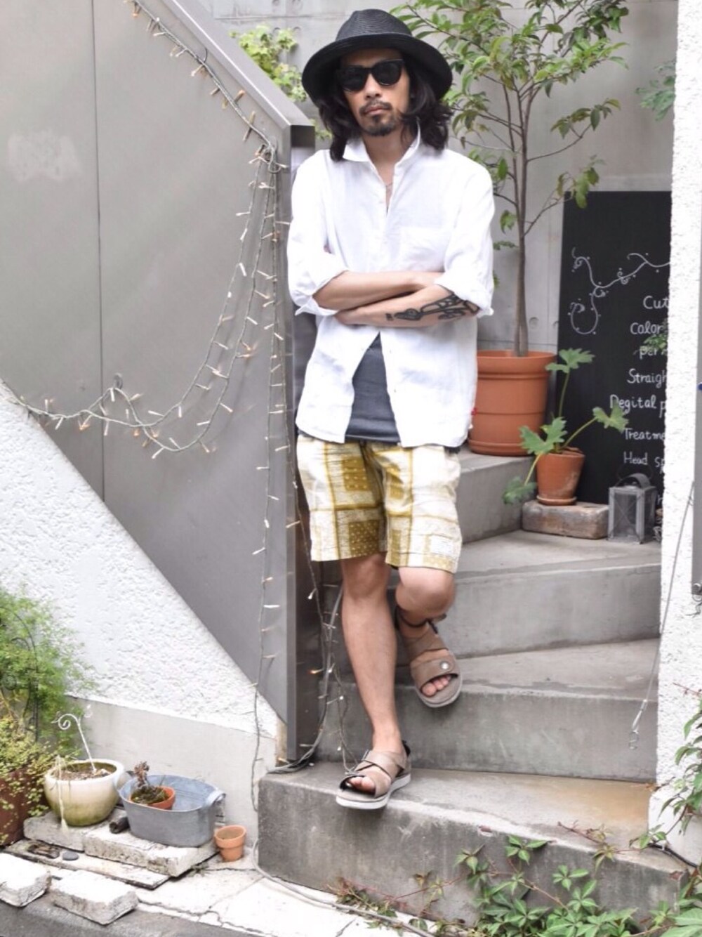 毎日柄ショーツ。 本日は直営店限定カラーの イエローです。 派手すぎずちょっと大人っぽい 色味なので意外とあわせやすく 気に入っております。 新作の麻7分シャツ白と ハットでちょっと上品に。