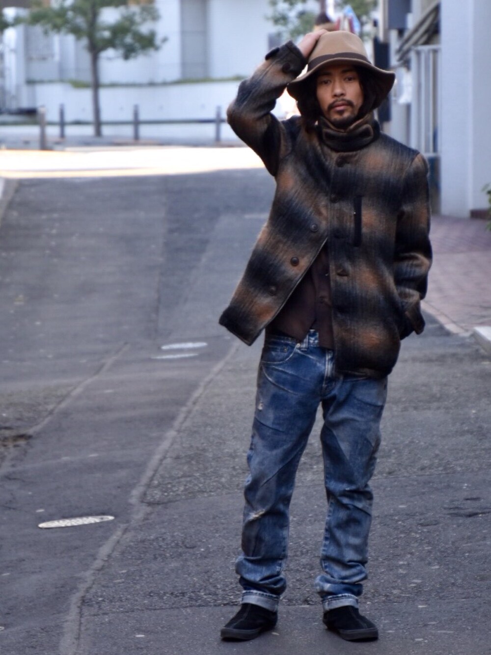 73.Yuma_Hatanoのピーコート「Native shadow wool coat」を使ったコーディネート