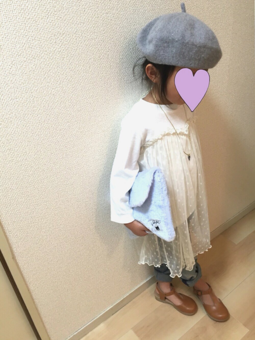見ていただき、ありがとうございます🙏💕 ♡、saveめっちゃ嬉しいです✨ またまたベレー帽です😅 トップスは店舗ですみれにおねだりされて、お値下げしてたので即購入♡笑。 ほんとは7分袖なのかな⁇ 長袖だと思って買ったんだけど、着てみたら120なのに袖丈がジャスト‼︎😳 着るまで気付かなかった〜😂笑。 そしてクラッチはDAISOで見つけました♡♡ フワフワですみれさんもお気に入り♬
