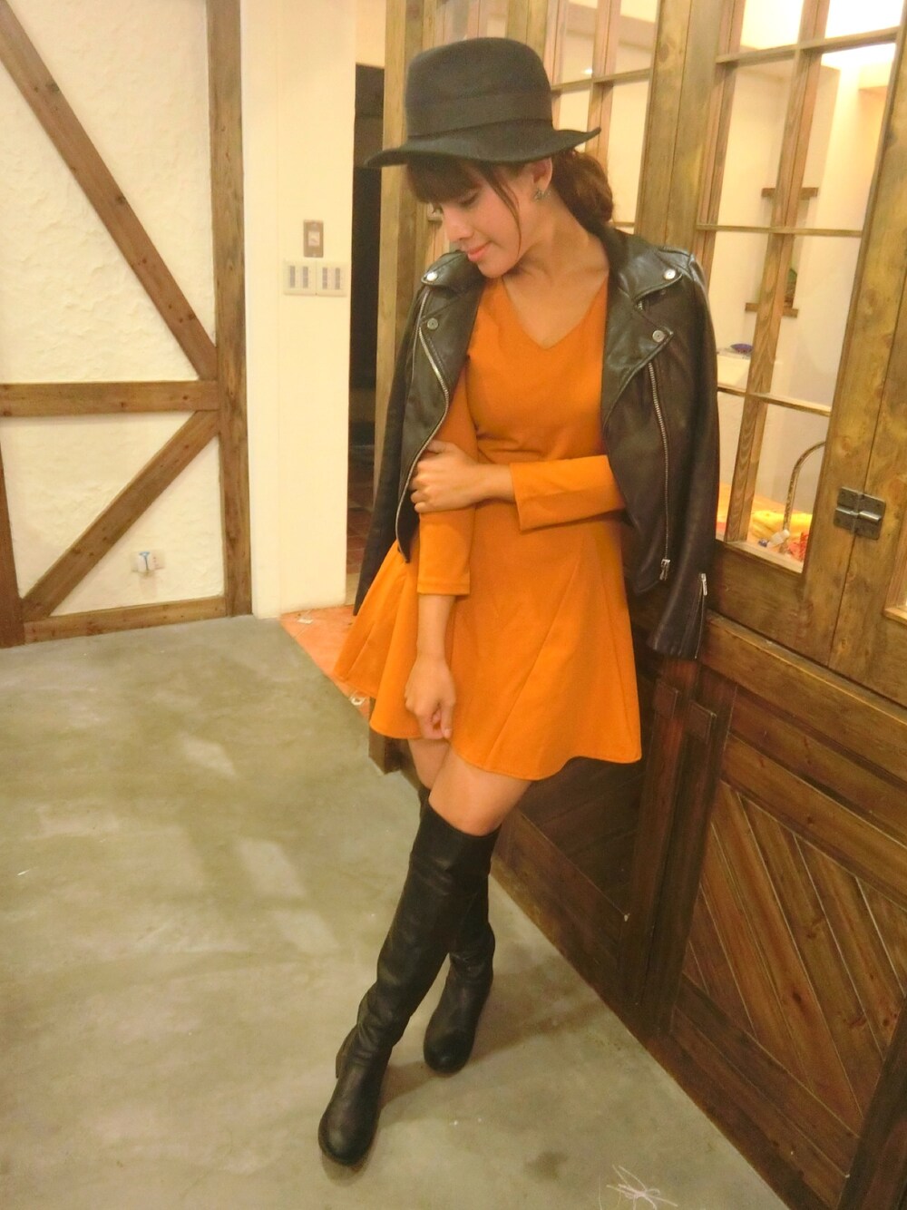 秋天必備的皮外套~披著都好看👍 橘色洋裝ㄧ年四季都可以穿~好愛橘色啊💖