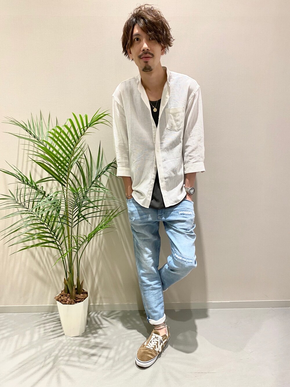 七分袖のパナマシャツ。 そして今年流行のバンドカラーでシンプルですが、オシャレに着ていただけます! また、ボトムはスウェットデニム!! お家でウェブ飲み会!なんて時も、さすがにパジャマは。。でも、デニムもしんどいし。。ってときも良いですよね!