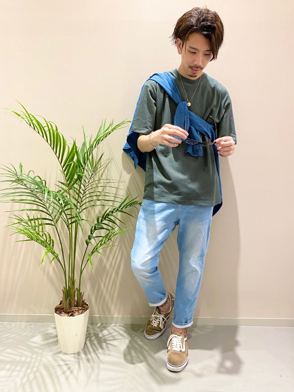 グリーンの麻混のトップス! 少しゆったりめに着てラフ感出すのがオススメです!!