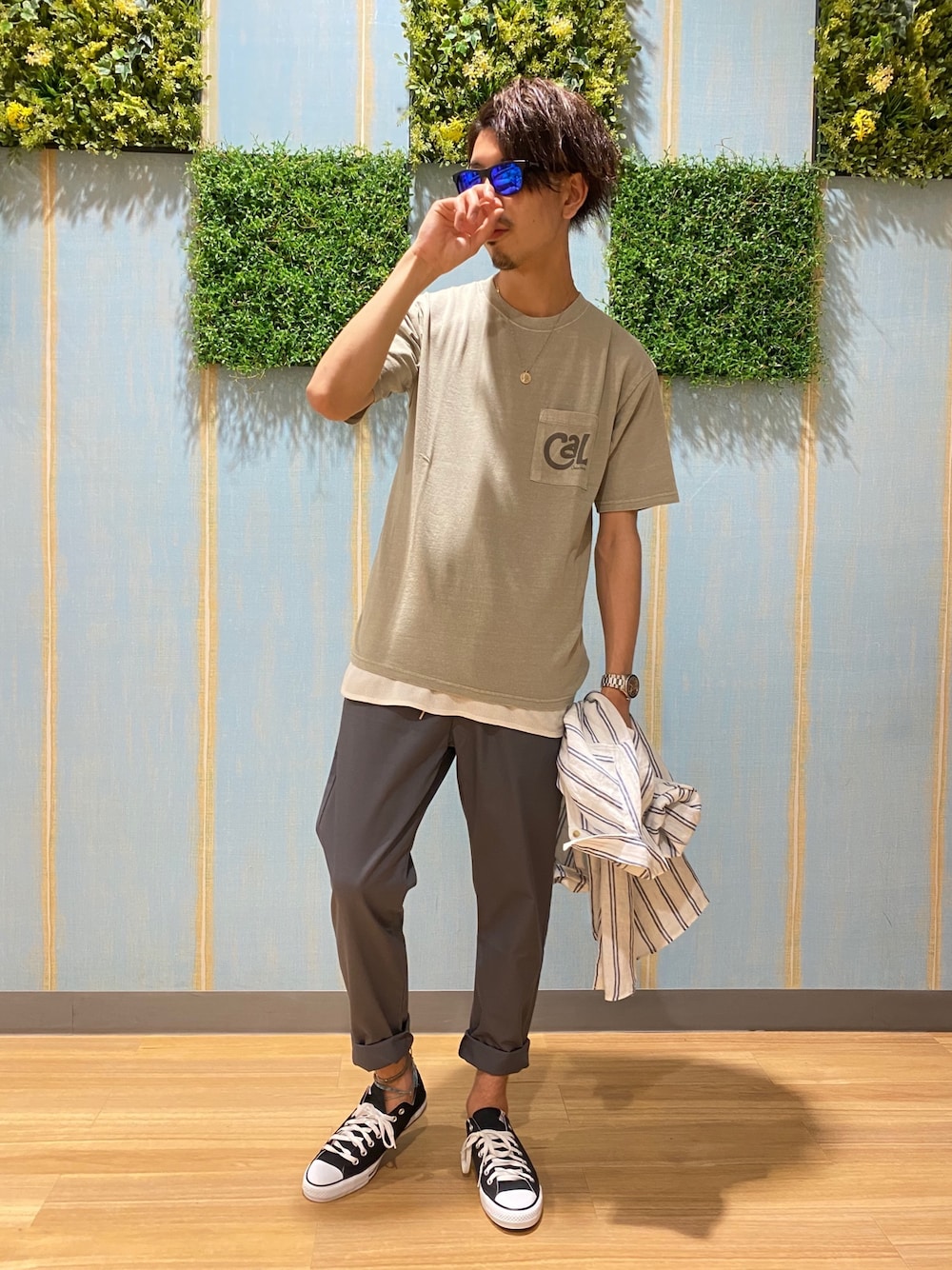 キッチンパンツにTシャツ合わせですが、ストライプシャツ羽織ってもオシャレ! ストライプシャツは麻素材なので、涼しく着て頂けます! また、シャツスタイルでも、パンツでラフ感も出せるので◎!!