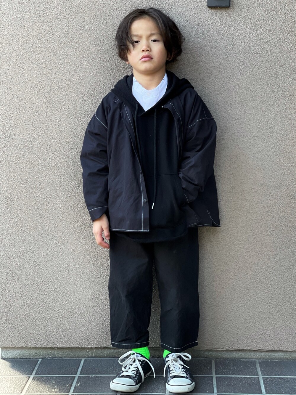 ブラック系のスニーカーを着用したキッズの冬コーディネートの1枚目の写真