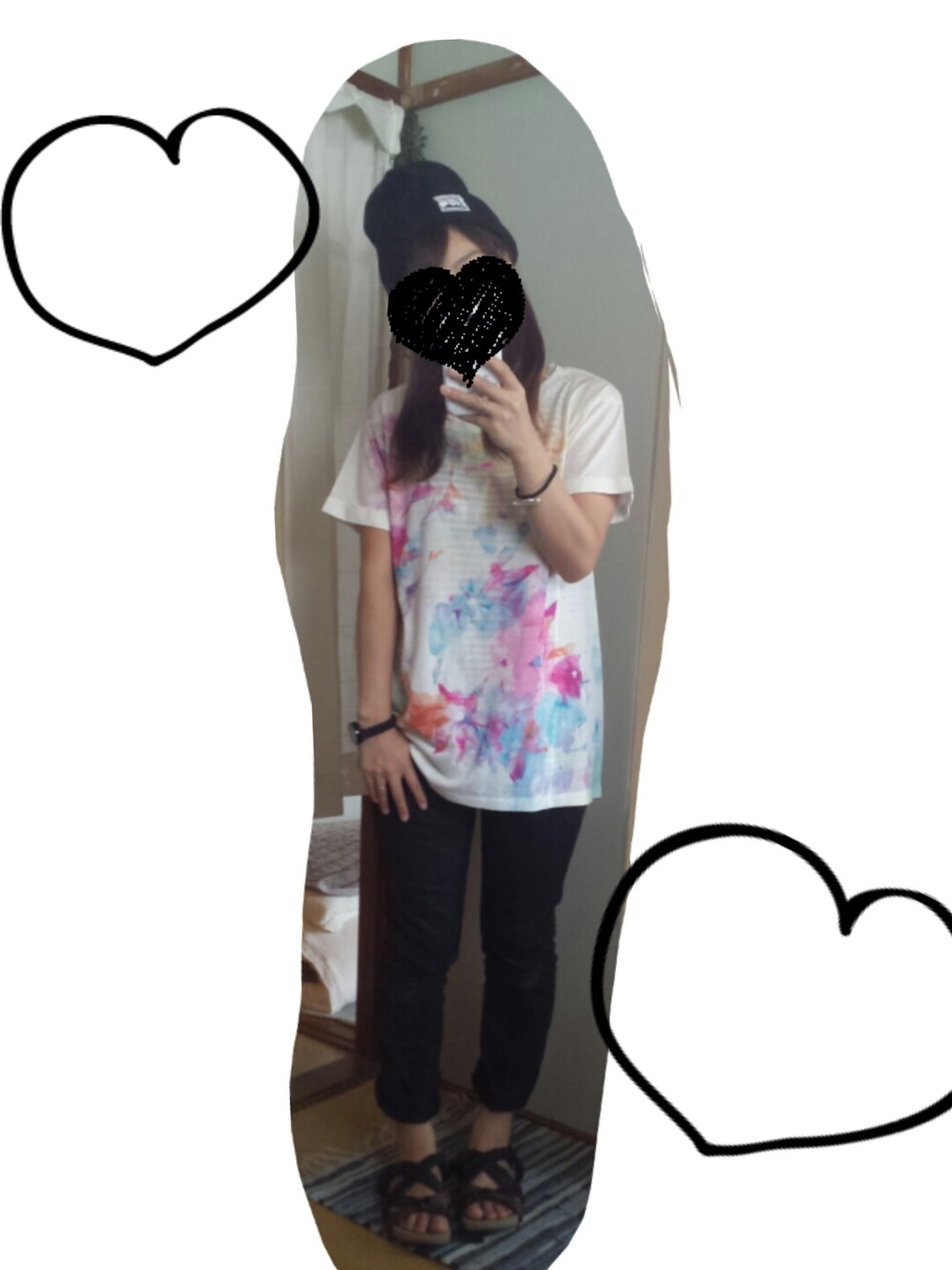 ニット帽 タンクトップ Tシャツ 黒パンツ サンダル サッカー、0-0でしたね~ 子どもと朝から見てました ( ・∇・) 今日はらくちんコーデです♪ やっぱらくちんが一番ですね~♪