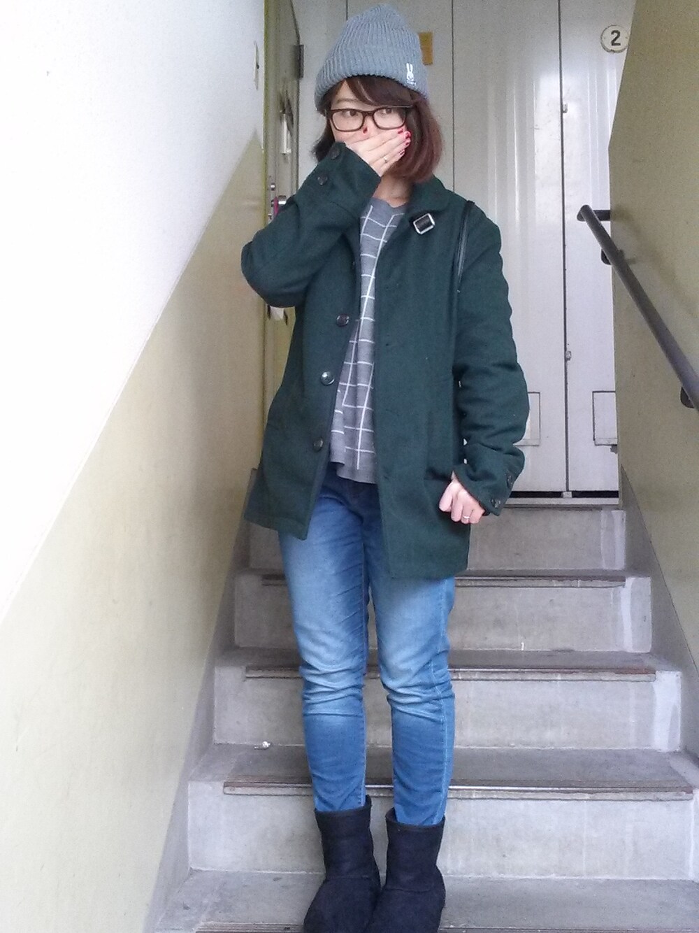 ニット帽 トップス ジーンズ ムートンブーツ コート リュック グリーンのコートはguのメンズ S サイズ⭐ 着た感じ、ちょった固いけど 色もデザインも値段もお気に入り~✨ あんま見えないけど、ネイルと靴下が赤です(^w^) CUNEのニット帽もかわぃくて、毎日かぶってます(*´ω`*) ワンポイントのうさぎもかわゅい💖