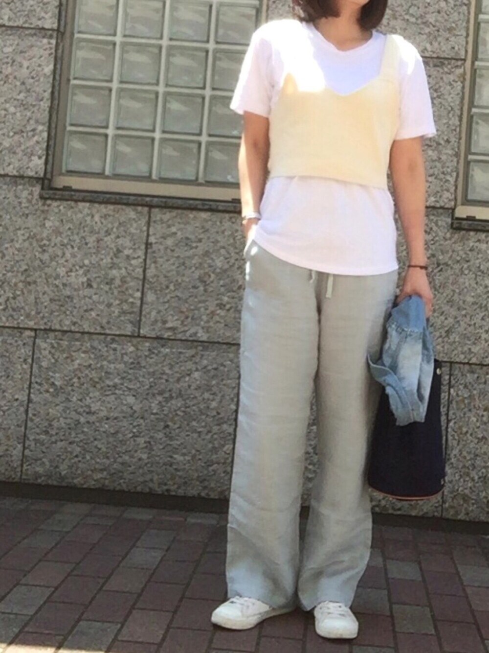 暑くなると履きたくなるリネン素材 Tシャツだけだとパジャマみたい😅なのでコットンニットのビスチェを重ねて……