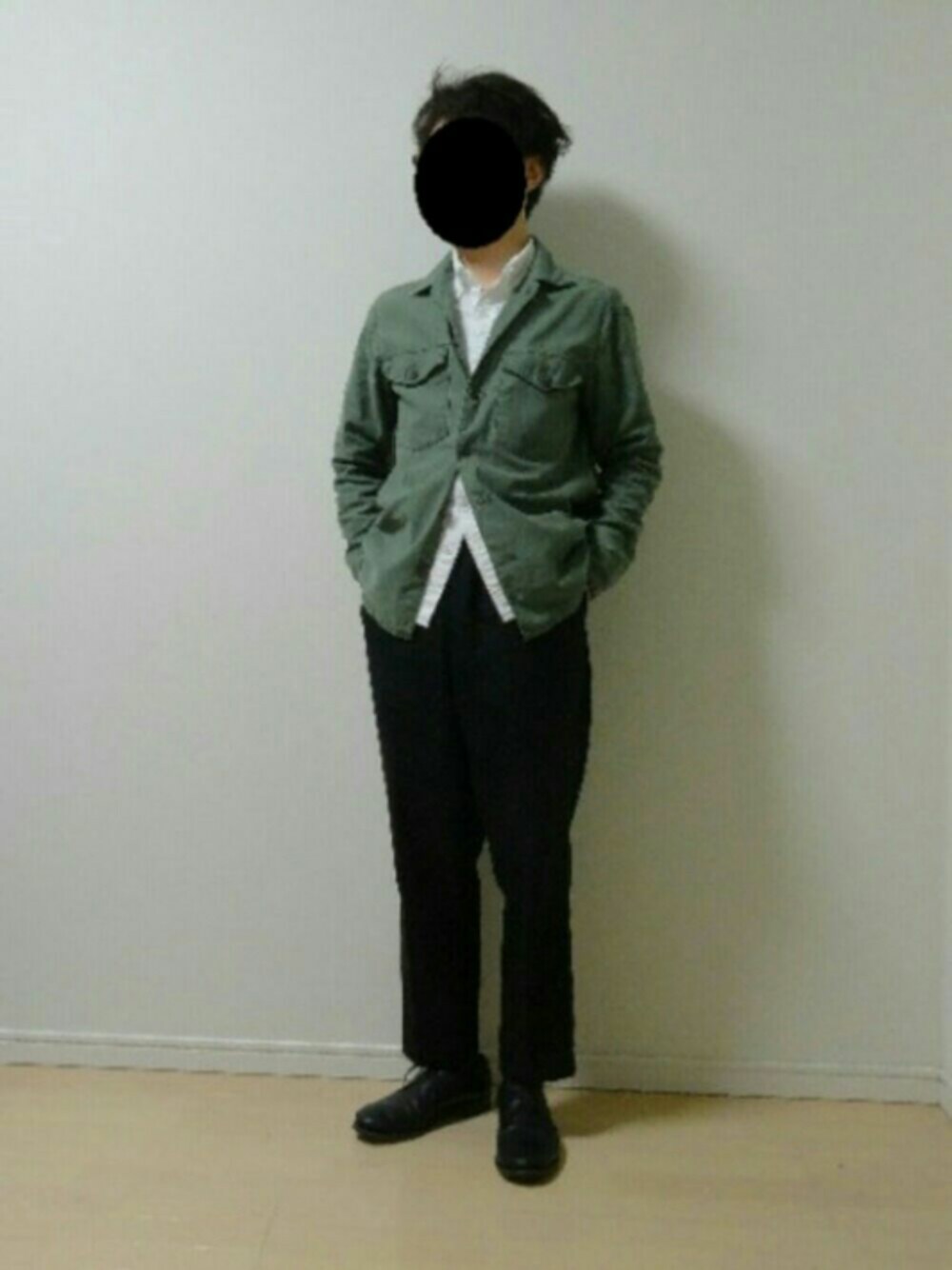 冬の室内、春・秋シーズンのコーディネートです。 上下のボリューム比率を4:6に設定し、スタイルアップを図りました。 「ボタンX留め」はウエストラインを上げ、脚長効果が出るおすすめの小技です。