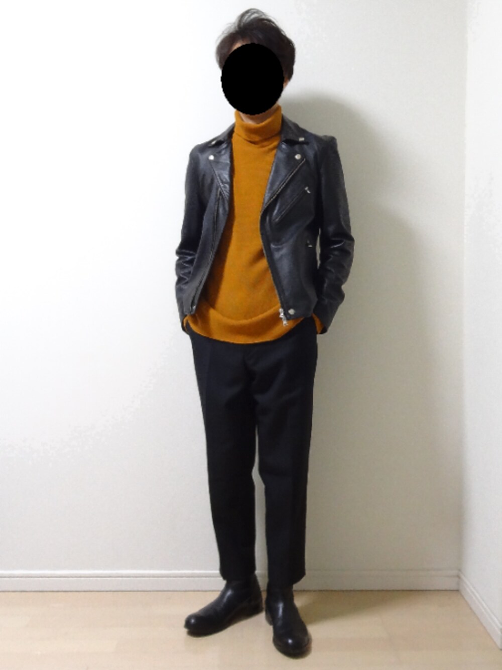 ダブルライダースを使ったモードライクなコーディネートです。 主張の強いオレンジ色のニット、ドレスライクなスラックス・ブーツを合わせ、ライダースのハードさを中和しました。 各アイテムの質感を合わせてまとめつつ、少しゆとりを持たせたシルエットにより緊張感を緩和しています。