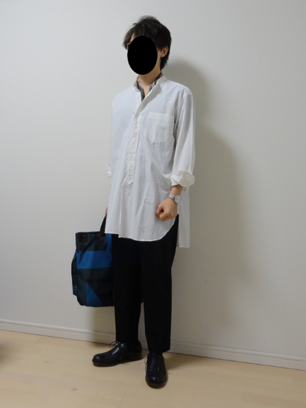 COMOLIのバンドカラーシャツを使ったコーディネートです。 ベースをシンプルに柄小物でアクセントを加えました。