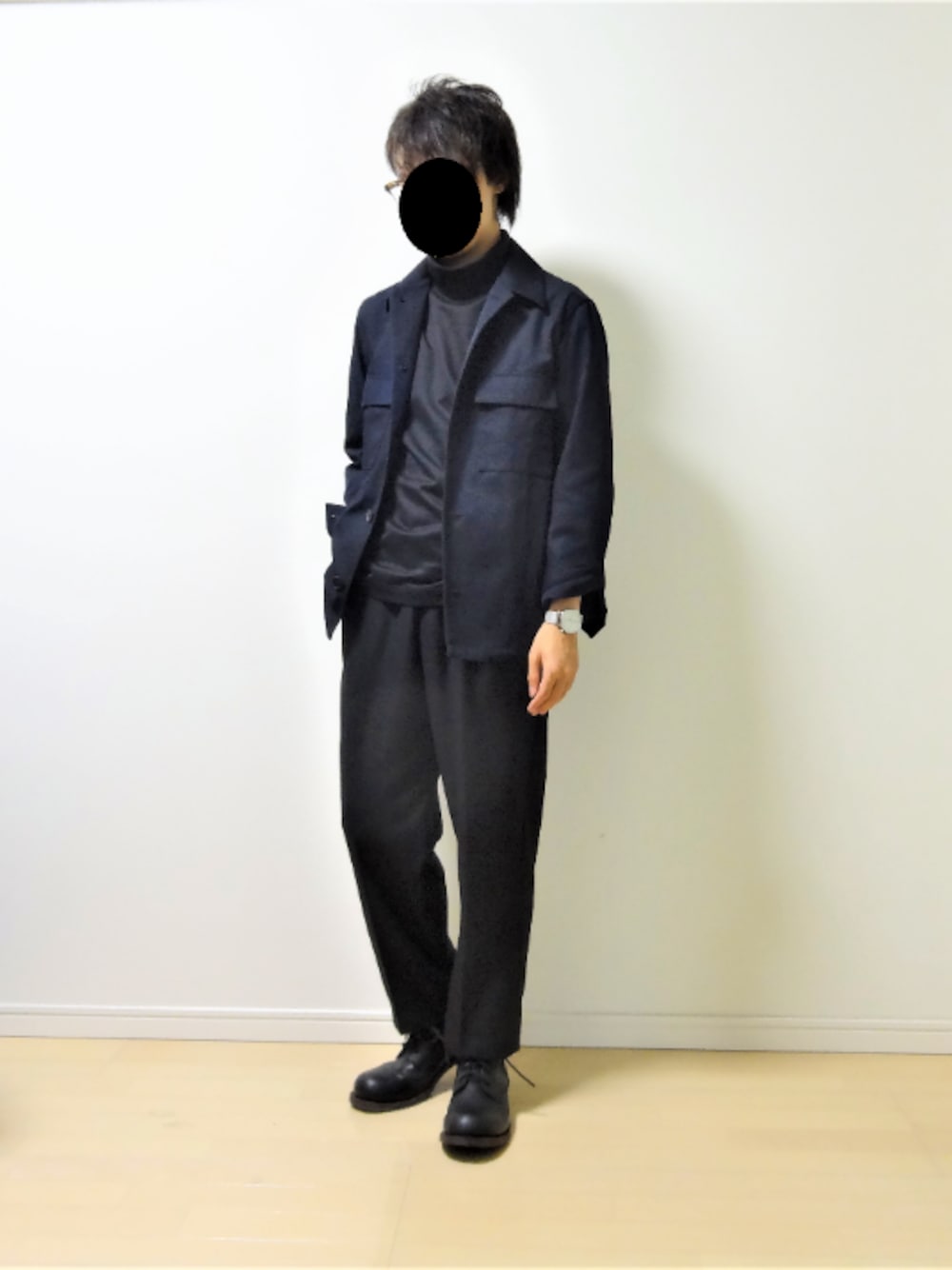 秋のイブニングコーデ ミリタリー&ワークをベースに艶のある素材感・ダークトーンで再構築しました。 使用したカットソーはUNIQLO U 2019AWのタートルネックT。 ブラックのみ1万円クラスの生地感のため、非常におすすめです。 なお、今回全型試着した結果、このカットソー、ブロックテックオーバーサイズコート 34BROWN、クルーネックT 38BROWNの出来が特に良かったです。