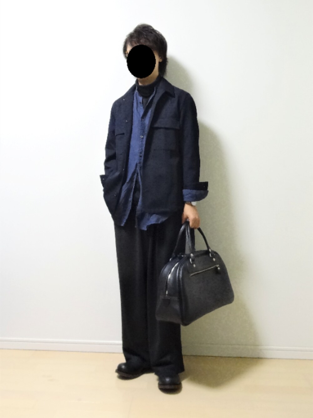 秋のレイヤードコーデ バンドカラーシャツのレイヤリングによりスタイルに奥行きを加えました