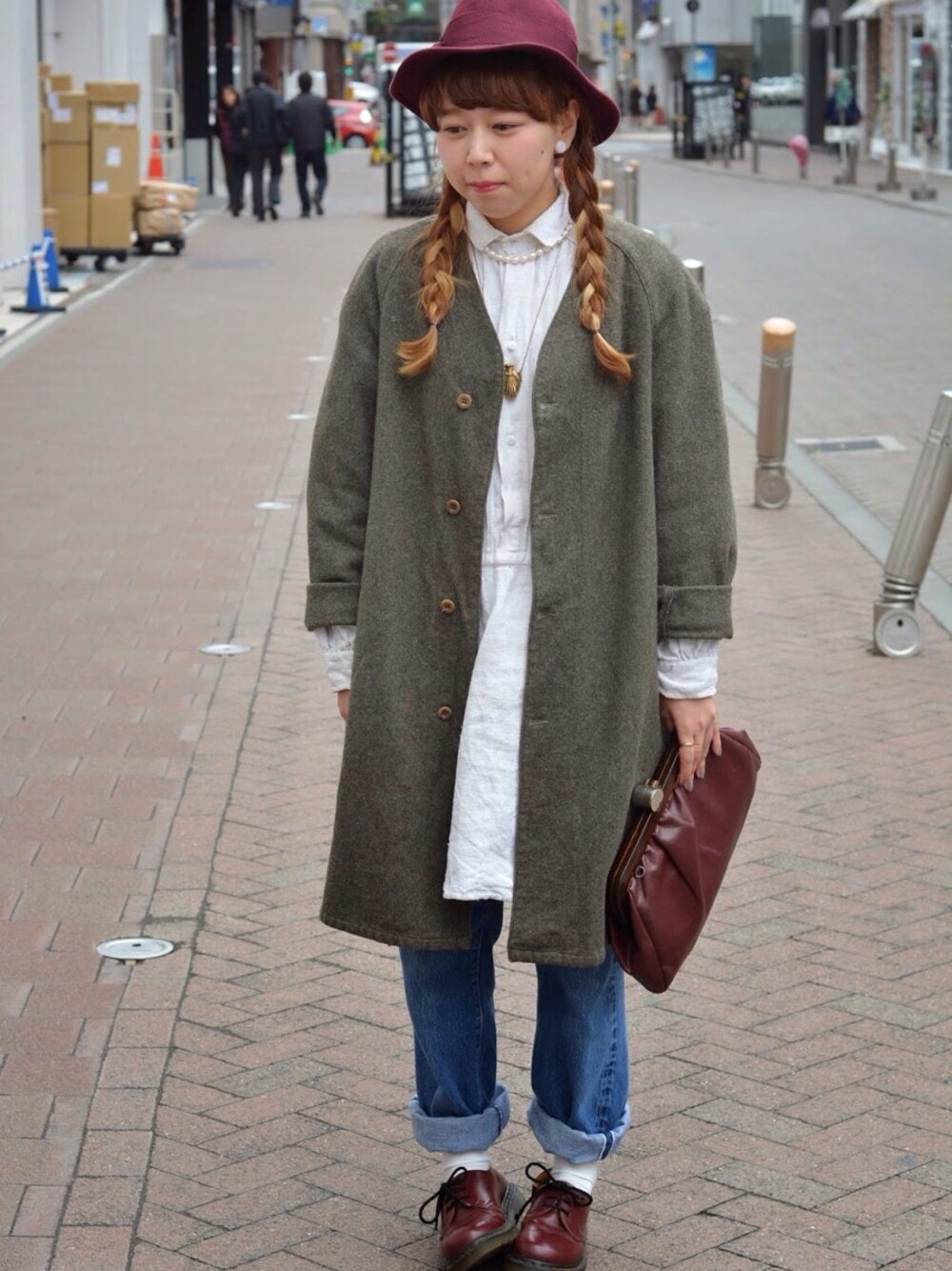トップス:30's パンツ:70's(Levi's) アウター:60's バッグ:60's シューズ:Dr.Martens ハット:used ヴィンテージずくしで ところどころエンジ色で