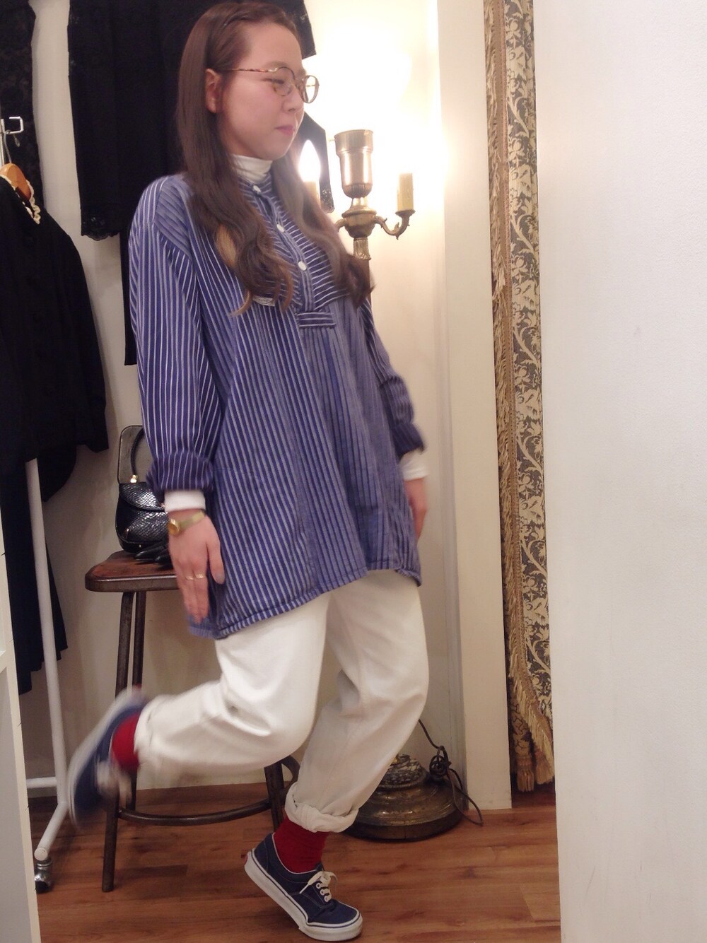 なんとも安くてゆるい格好。 やや春を意識して。 フィッシャーマンシャツ:VINTAGE ホワイトデニム:Levi's スニーカー:VANS えら メガネ:Jins