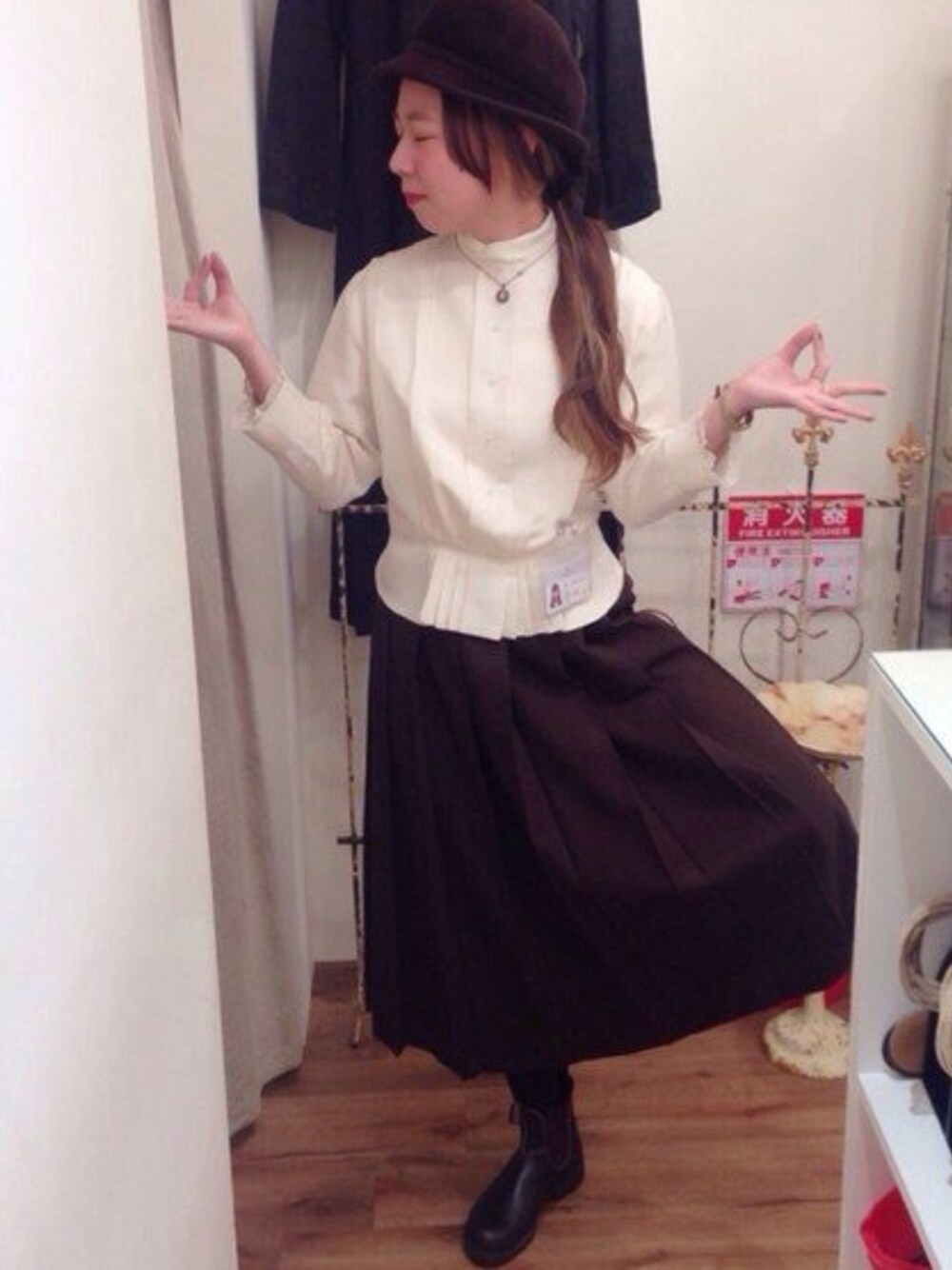 トップス:アンティーク 1900年代のシルクブラウス (こりゃあレアでしょうよ) ボトムス:ヴィンテージ 50's デットストック シューズ:Blundstone 帽子は婆ちゃんの 昔のお手伝いさん的ファッション