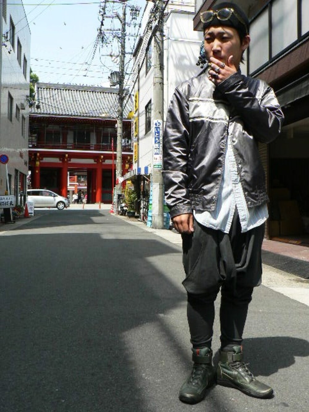 その他のナイロンジャケット、ブラック系のキャップを着用したメンズの春コーディネートの1枚目の写真