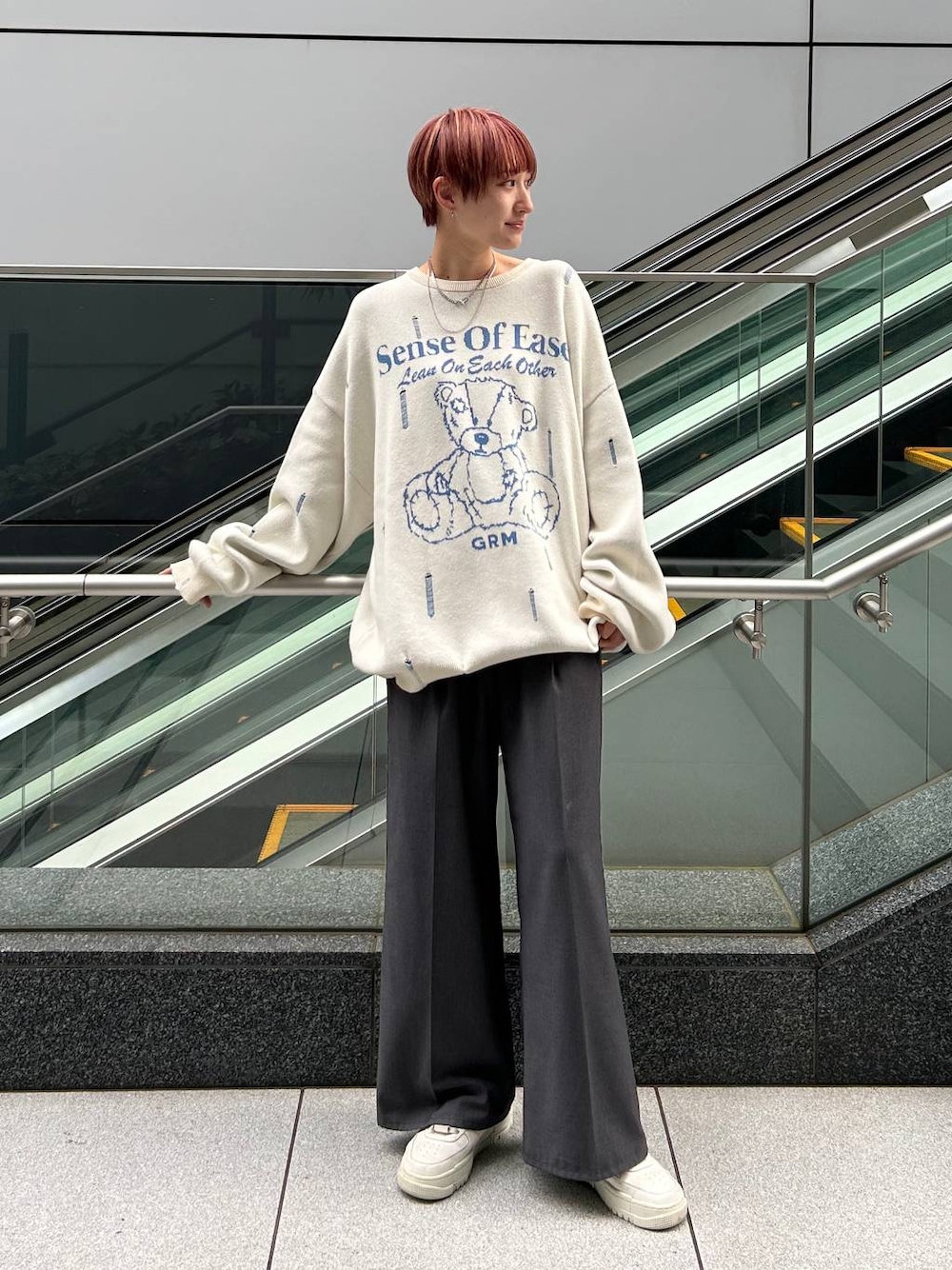 【トップス】 ・生地はふわふわというよりしっかりしている素材。 ・厚手すぎないのでアウターも合わせやすいし、秋から冬にかけて長く使っていただけるアイテムになっています! 【ボトム】 ・164cmでGサイズ着用。 ・シルエットめっちゃ綺麗なスラックスアイテム! ・サイドのラインが少しダメージっぽくなっていて、キレイめになりすぎず着られます。