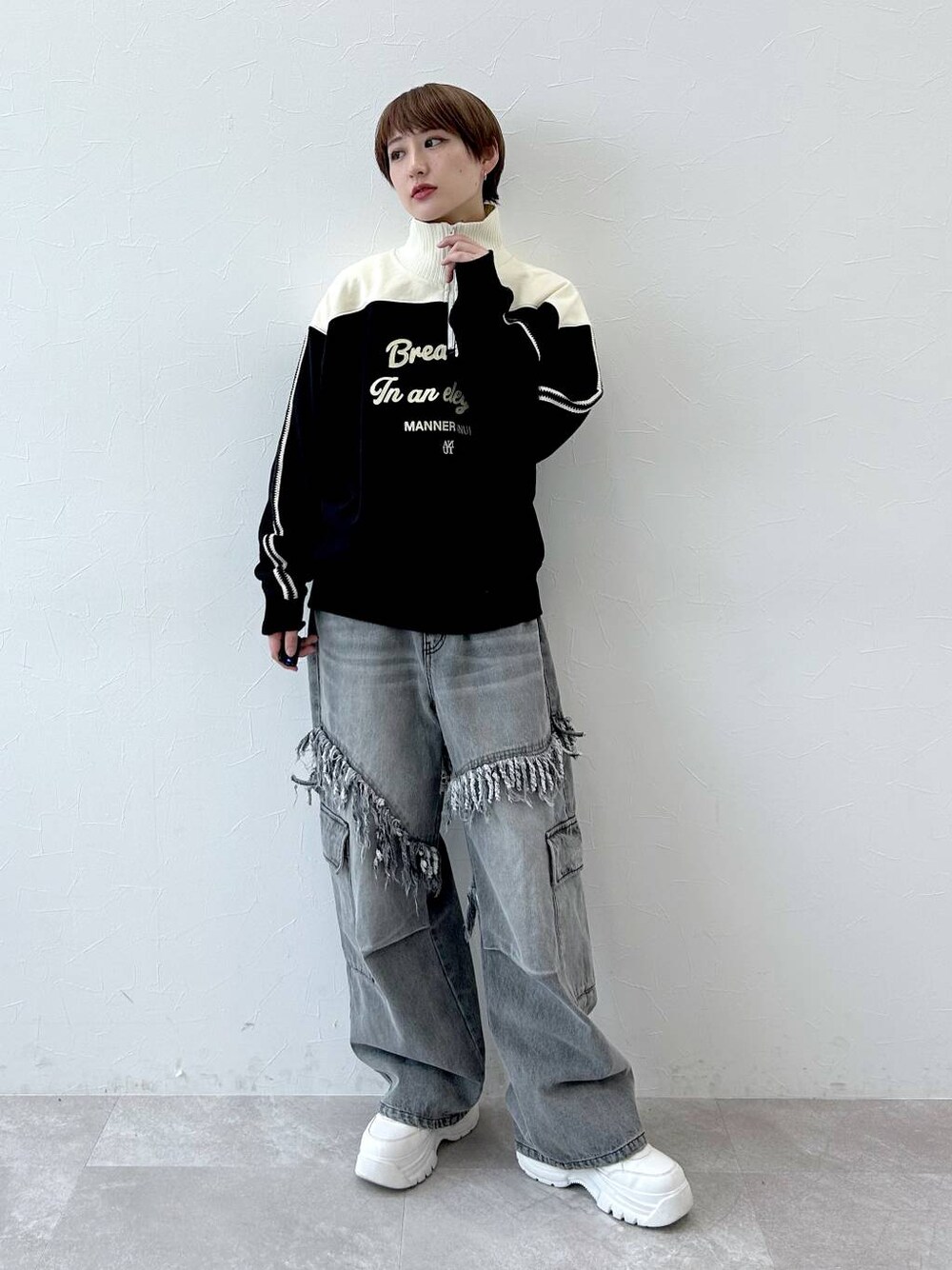 【トップス】 ・袖のラインもデザインになっているのがポイント! ・ハーフジップ上げても、長すぎないので、苦しくないです! 【ボトム】 ・フリンジのデザインがポイントになるデニムアイテム! ・私の身長でRサイズだと、ちょい厚底を合わせてジャストの丈です!