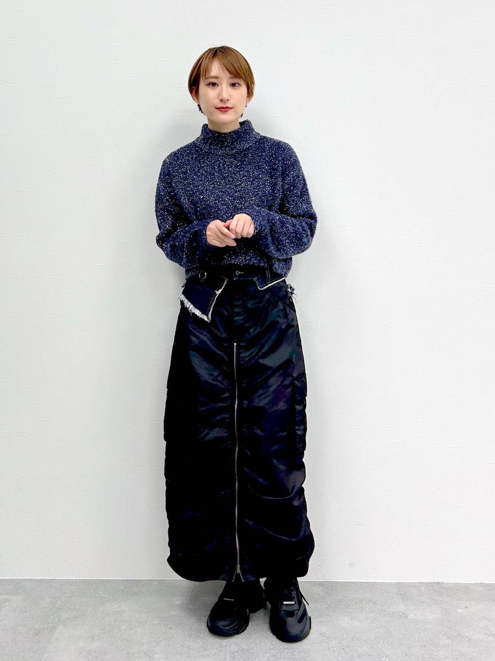 【トップス】 ・ネイビーで落ち着きつつ、ラメがアクセントになる、可愛いトップス見つけました! ・丈は短すぎないのが⚪︎。ハイウエストのボトムと合わせれば、前だけインもできる丈です。 ・柔らかい素材だし、ハイネックも低めなので、苦しくないです! 【ボトム】 ・MA-1のスカートアイテム! ・1枚で着てスカートとしても使えるし、中にパンツを合わせてもかわいいアイテムです。 ・ブラックの方は中のカラーがオレンジ、グレーの方はグリーンになっていて、かわいいポイントです!