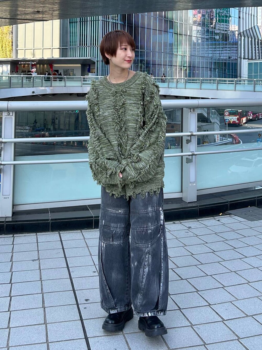【トップス】 ・前後2way仕様のニットアイテム! ・フリンジでふわっと感はありますが、膨らまずにストンと落ちる素材のニットになっているので、着膨れしづらいです。 ・袖や裾にもダメージがあって可愛い! ・柄があるニットじゃないのに、アウター羽織っても主役になれるようなデザインです! 【ボトム】 ・人気の箔プリントデニム! ・164cmでGサイズ着用。 ・他のAnuiのデニムよりも少し短めに感じたので、私くらいの身長の方なら、Gサイズならぺたんこシューズ、Rサイズでも厚底じゃないシューズでも合わせられそうです⚪︎。 ・低身長さんにはGサイズがおすすめ!