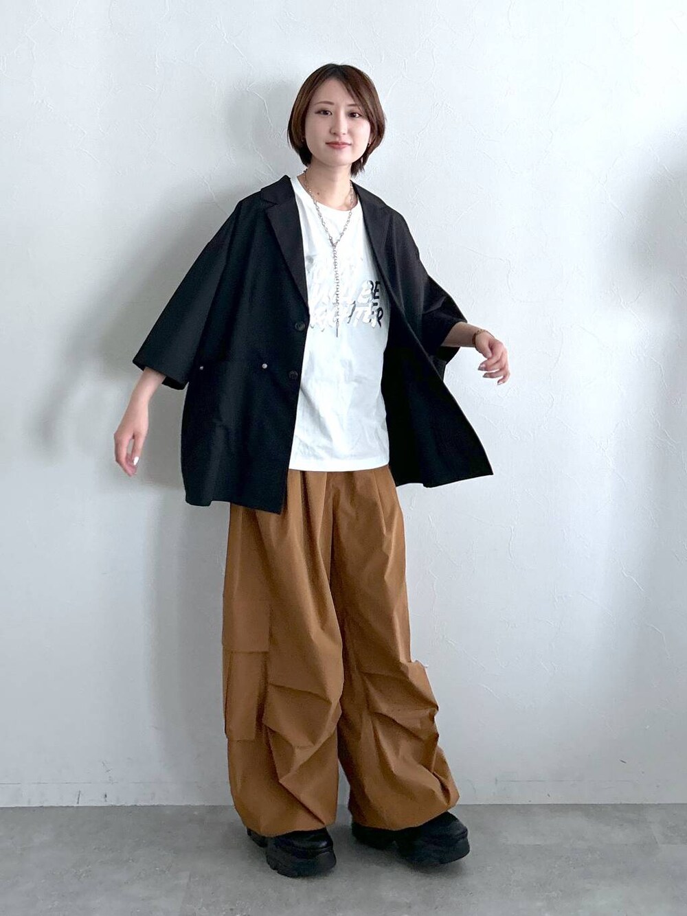 【Tシャツ】 ・リアルバイ! ・肉眼で見ると、商品ページ画像より、綺麗に箔が輝く感じがします! ・サイズ感はコンパクトすぎず、大きすぎず、インナーに使いやすいサイズ感。 【ジャケット】 ・リアルバイ! ・肩が落ちたデザインなので、メンズレディース関係なく、骨格も関係なく、着こなしやすいアイテムになっています! ・素材は薄手でサラサラ。インナーを変えれば、真夏にも着られそうです! ・近くで見るとストライプデザインなのもポイント! 【パンツ】 ・164cmでR2サイズ着用。 ・新しいパラシュートパンツが登場しました! ・素材はさらっと軽くて、夏にも履きやすい。 ・商品ページ最後の生地寄りの画像、チャコールとブラウンがわかりやすいですが、生地自体に少しデザインがあって、近づいてみても可愛いのがポイントです。 ・パンツ横のボタンでシルエット変えられます!