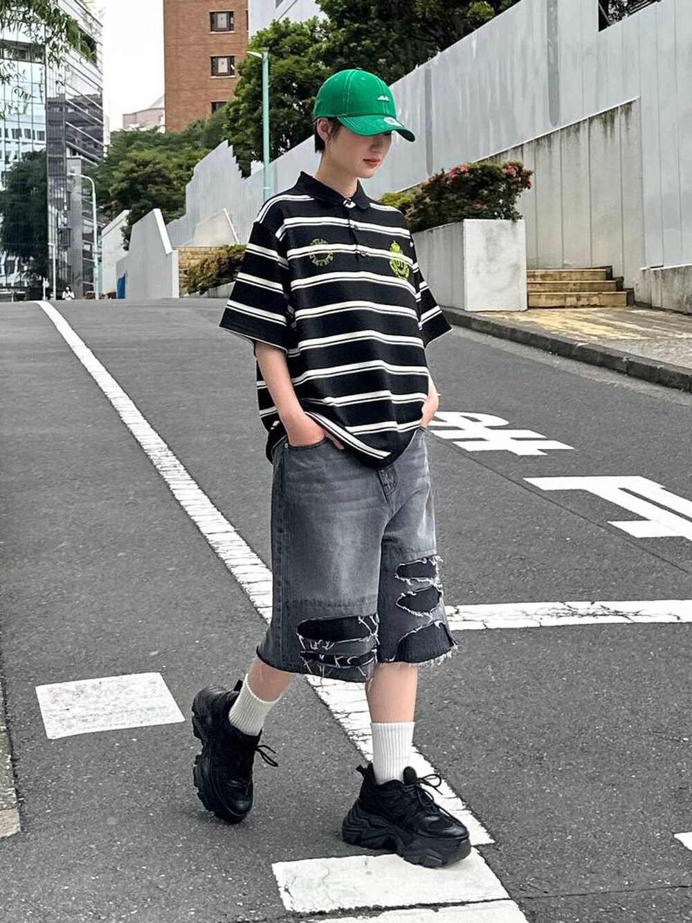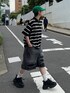 【トップス】 ・胸元の刺繍のエンブレムがワンポイントになるアイテム! ・素材もさらっとしていて、着心地◎です。 ・丈はルーズすぎないので、ショートパンツとアウトで合わせても、ちょうど良いバランスで着られました!