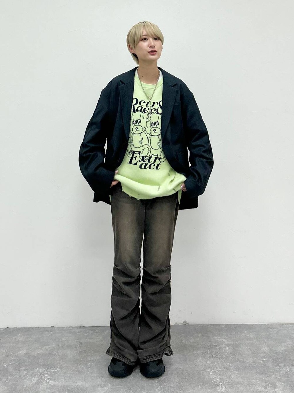 【トップス】 ・GRMベアーデザインのニットが登場! 去年人気だったアイテムが、デザイン新たに今年バージョンで登場しました! ・着用は新色のライム🍋🟩 ・厚手すぎないニットなので、スウェット感覚で着やすいです!春まで着られるニット! ・生地もしっかりしていて、長く使えそうなアイテム✨ 【ジャケット】 ・さりげなくストライプが全体に入っているので、無地よりおしゃれに、がっつり柄デザインより着回ししやすく使えるアイテムです。 ・セットアップで着られるパンツも展開あり。 ・ルーズなシルエットですが、丈は長すぎないので、少し綺麗めなスタイリングにもできます! 【パンツ】 ※リアルバイのR1サイズを着用。 ・厚底で合わせると、めちゃくちゃ足が長く見えます! ・ストレッチはありませんが、柔らかい素材なので、着心地○です。