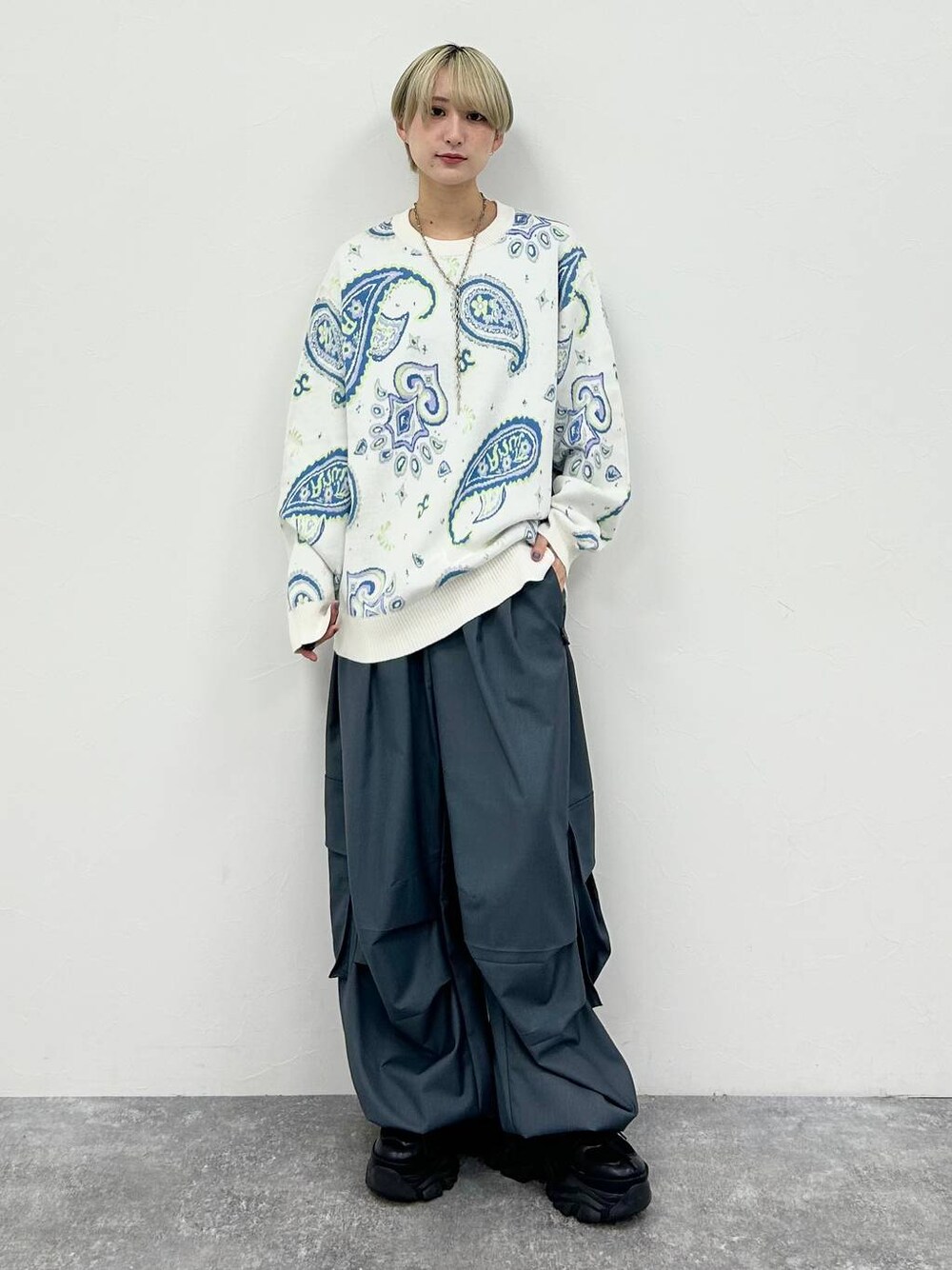 【トップス】 ・珍しいデザインがポイントになるニット ・ジャガード織りなので、生地しっかりしています! ・ふわふわしない素材なので、冬だけでなく秋冬にも使える万能ニット! 【パンツ】 ・164cmでR2サイズ着用。程よいルーズ感で履ける、ちょうど良いサイズです○ ・裾が絞れるので、私の身長だと、どのサイズも履けました!G2サイズだと絞らずにスニーカー合わせもできるサイズ、 R2サイズで絞らないと厚底合わせたい丈 M2サイズだと裾絞るのはマストで、他に無いルーズ感のあるシルエットになっています。 ・以前販売時に大人気ですぐ完売したタックパラシュートパンツの新作が登場! ・スーツ系の素材で、カジュアルになりすぎず、ちょっと綺麗にも使えるのがポイント! ・前回同様、シルエットが神がかっています✨