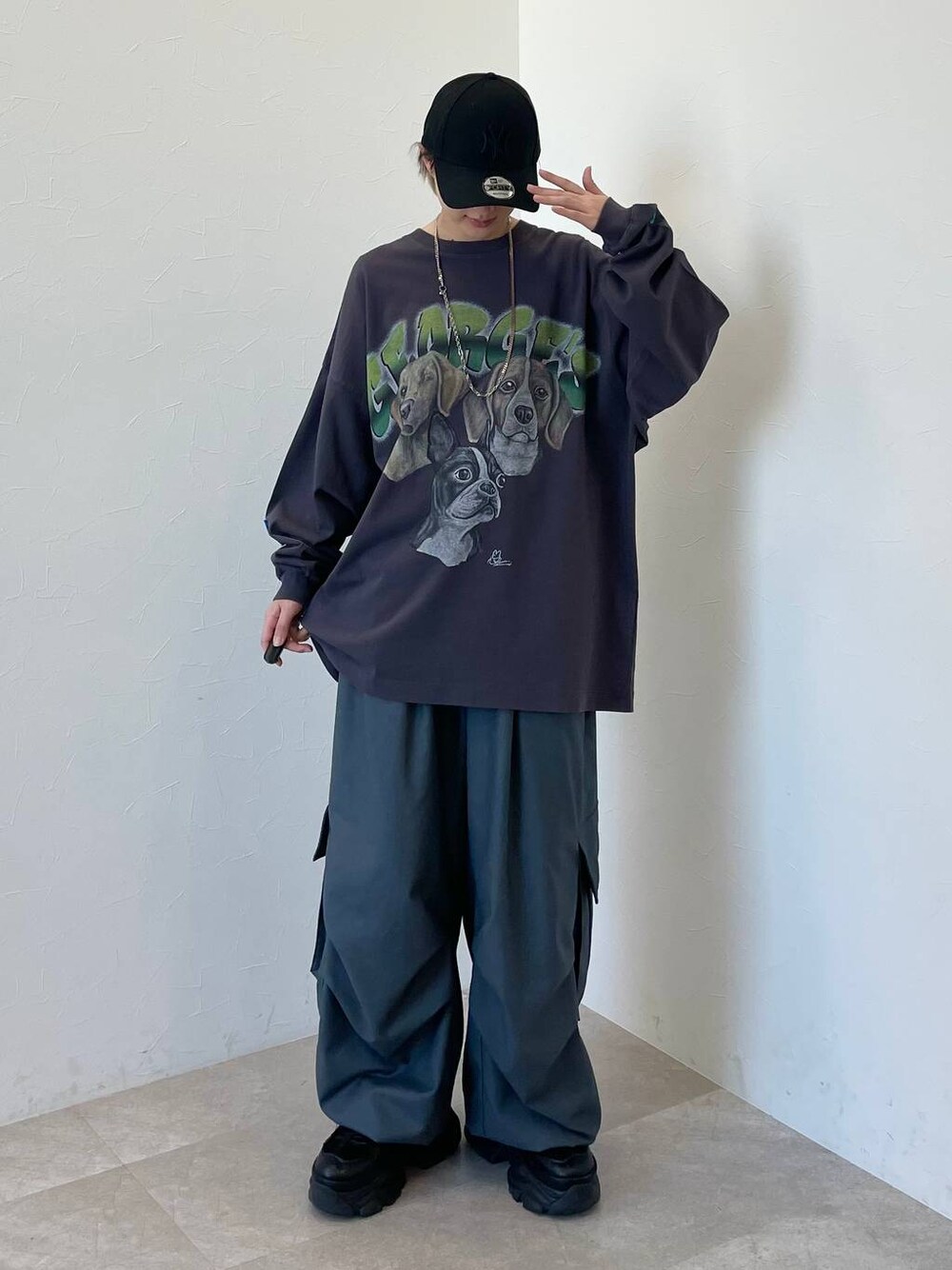 【トップス】 ・ルーズなサイズ感とインパクトのある犬デザインが可愛いTシャツ! ・お尻しっかり隠れるサイズになってます! ・犬好きにぜひチェックしていただきたいアイテムです♡ 【パンツ】 ・164cmでR2サイズ着用。程よいルーズ感で履ける、ちょうど良いサイズです○ ・裾が絞れるので、私の身長だと、どのサイズも履けました!G2サイズだと絞らずにスニーカー合わせもできるサイズ、 R2サイズで絞らないと厚底合わせたい丈 M2サイズだと裾絞るのはマストで、他に無いルーズ感のあるシルエットになっています。 ・スーツ系の素材で、カジュアルになりすぎず、ちょっと綺麗にも使えるのがポイント!