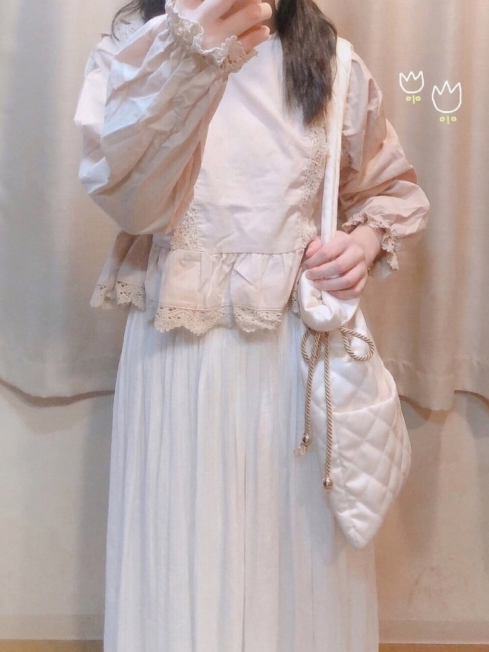 凄く好みで色違いのトップスもゲットしちゃいました🛍優しい色でとてもお気に入りです🌟 スカートは透けやすいので中にペチコートを履くのがオススメです👌🏻リバーシブルで裏もレースでとっても可愛いです💖 トートバッグは両端一緒に結ぶと巾着型になります🧸