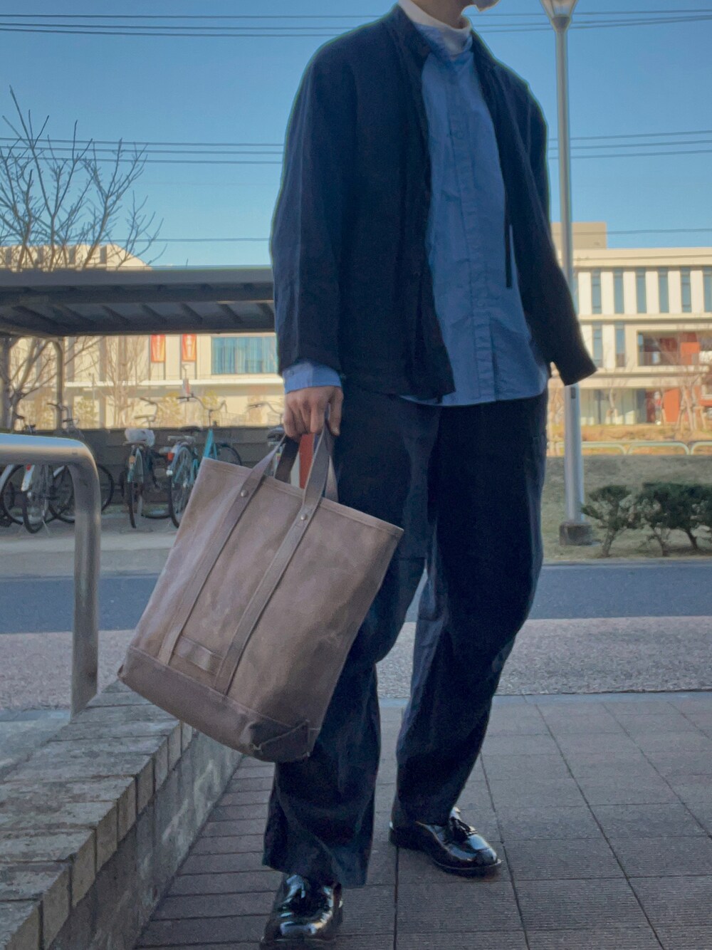 昼間暖かかったので春らしい装い。 まだ肌寒さもあると思いノーカラーシャツからタートルネックのインナーを選びました。 Confect のセットアップは今年もお世話になります。