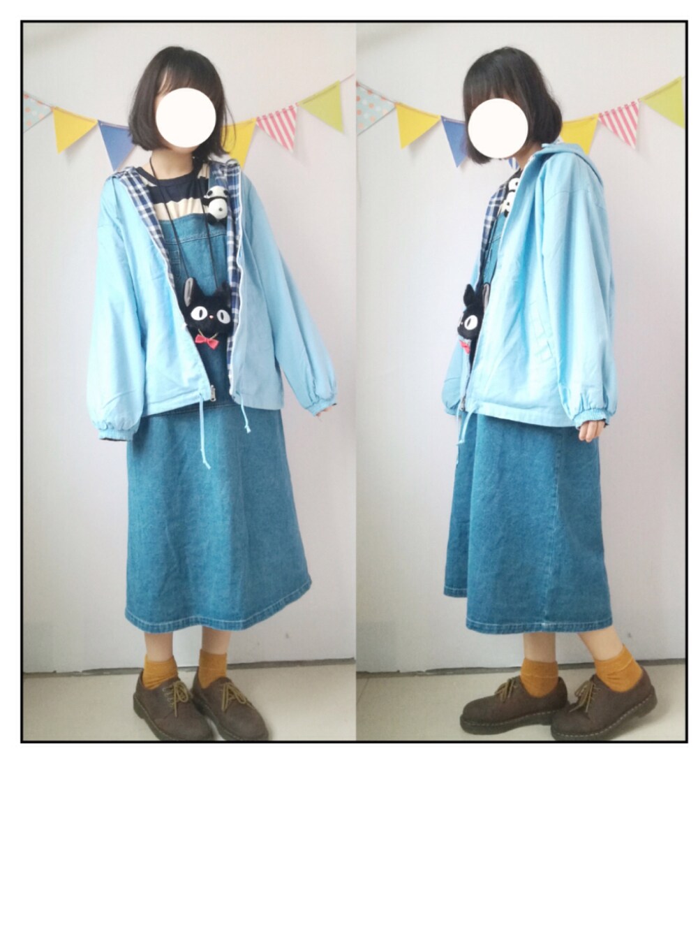 ブルー系のジャケット/アウターを着用したレディースの秋コーディネートの1枚目の写真
