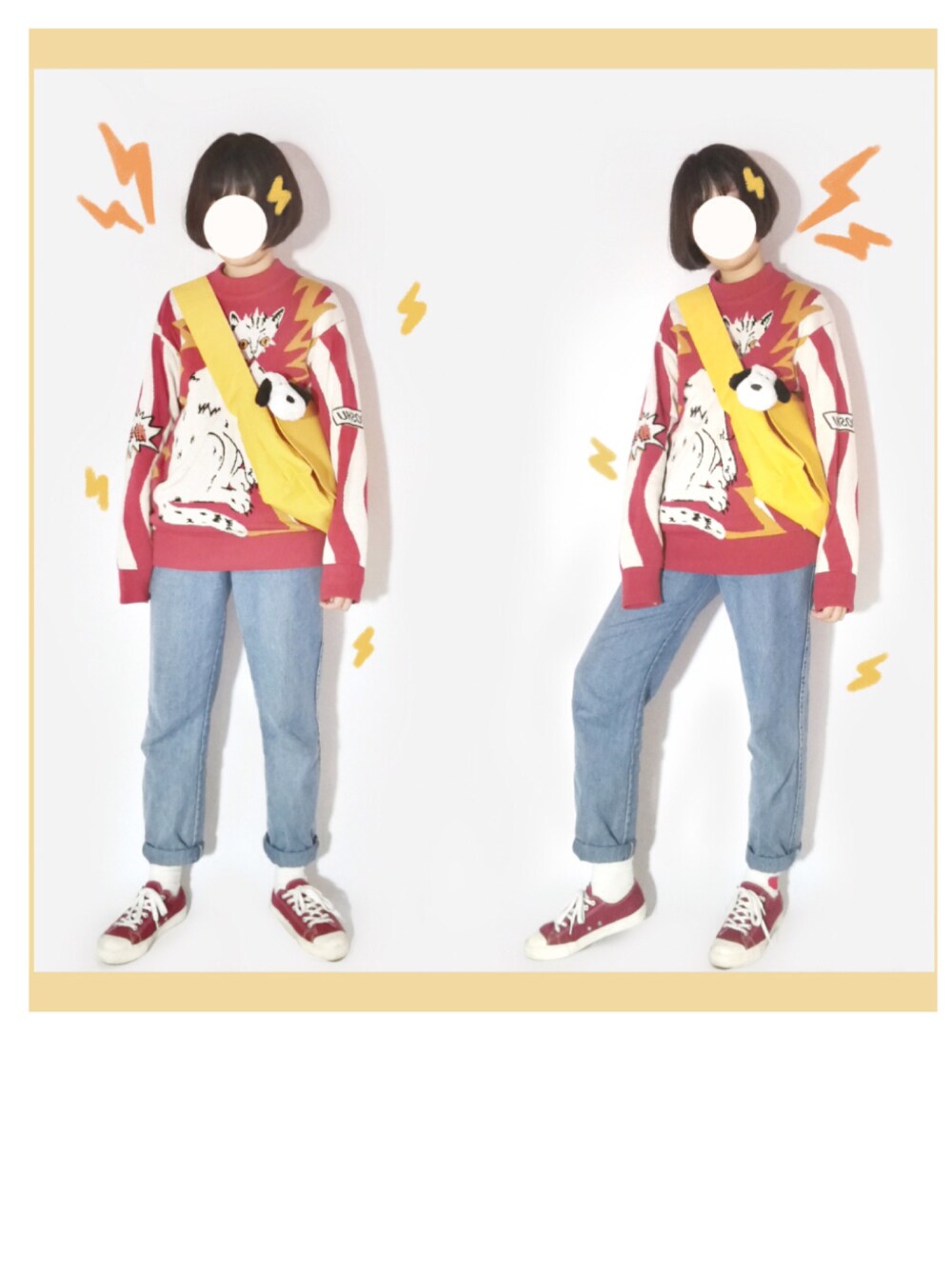 レッド系のニット/セーターを着用したレディースの秋コーディネートの1枚目の写真