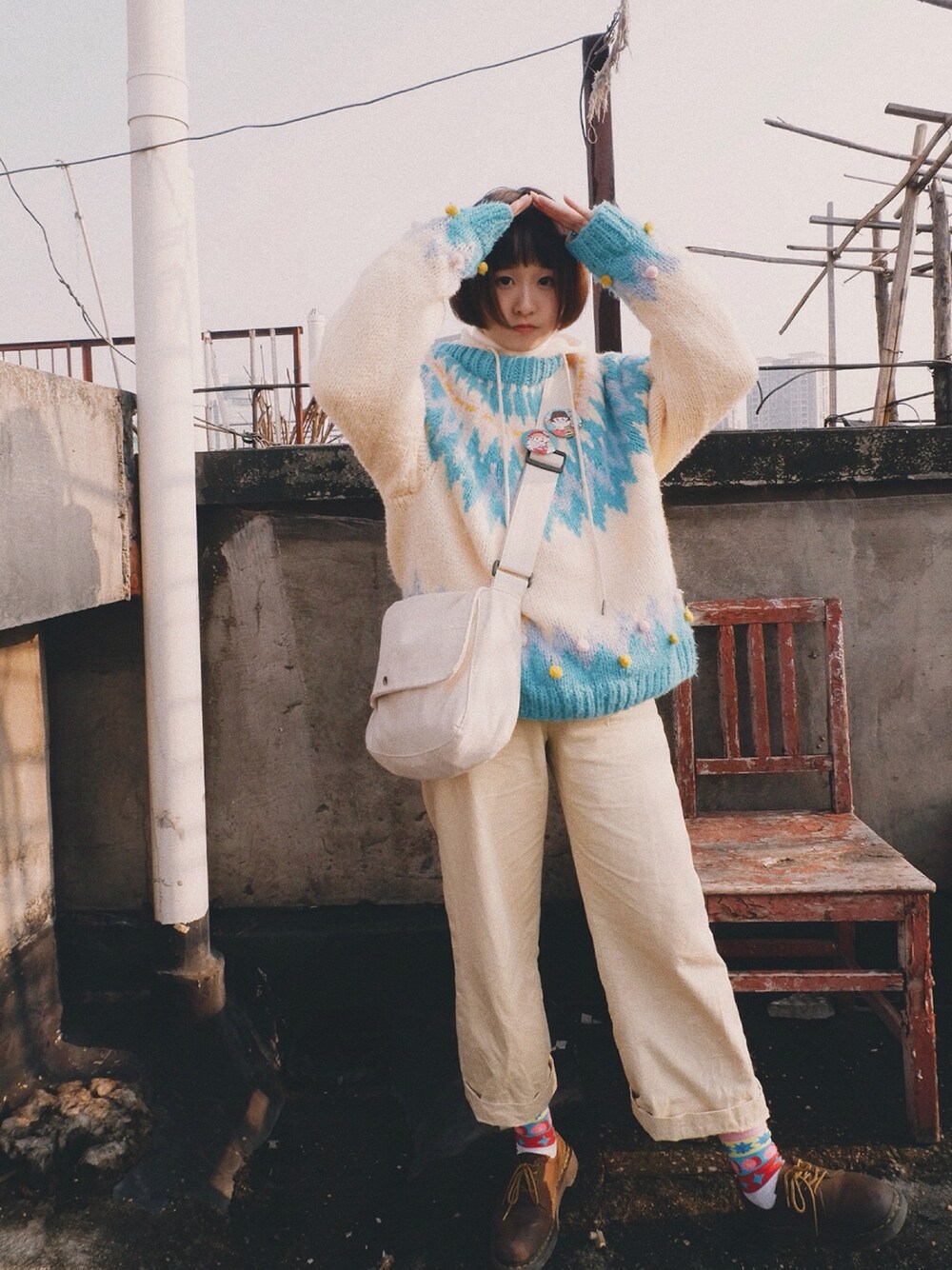 ブルー系のニット/セーターを着用したレディースの冬コーディネートの1枚目の写真