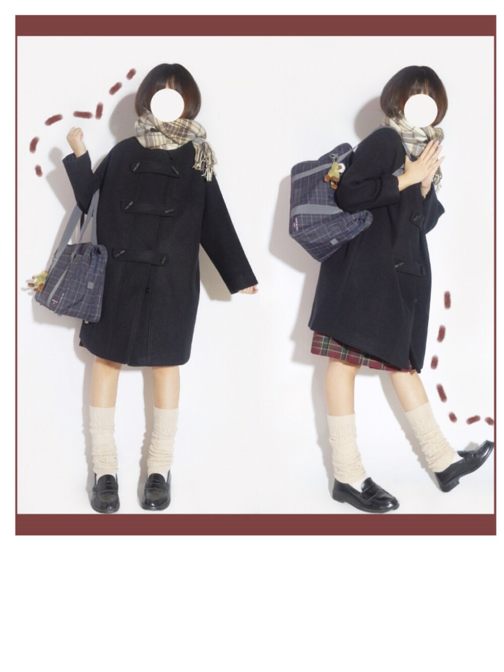 ブラック系のダッフルコートを着用したレディースの冬コーディネートの1枚目の写真