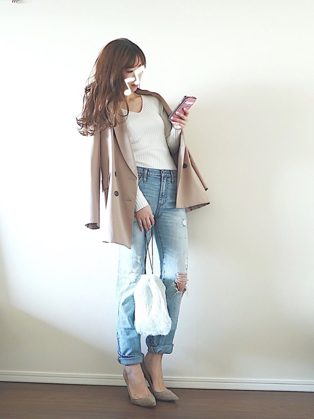 お昼間は暖かくなったなー☺️☺️✨ 薄い色のデニムとか白のトップス合わせるのが好き❣️❣️✨ ジャケットだけどかなりカジュアルにしたよー👍👍ファーbagお気に入り💕💕 これ、実はミントグリーンなんだけどほんのりグリーンだから合わせやすい😆😆✨みんなのコーディネートも春めいてきてるな〜🌸🌸✨