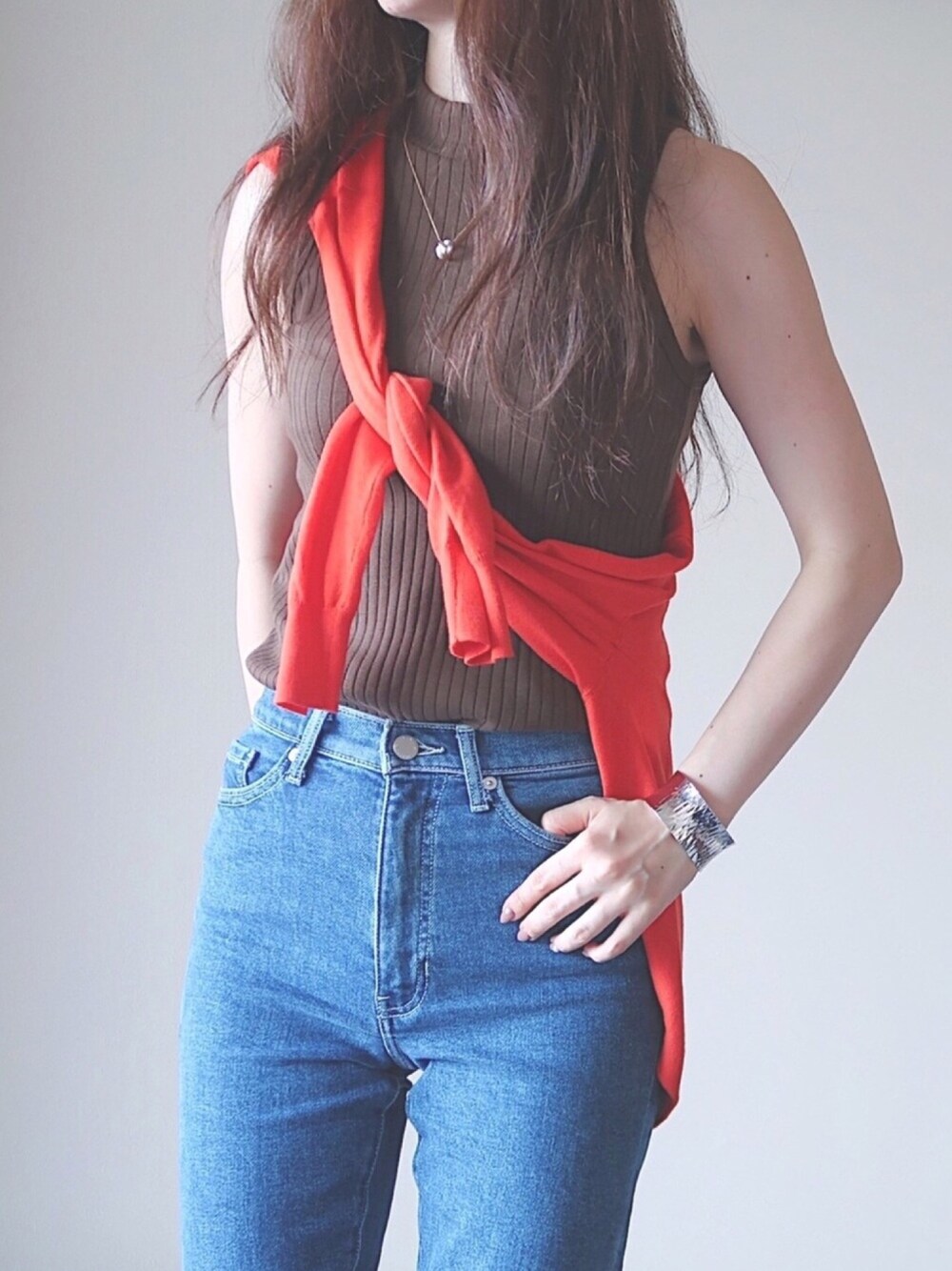 インスタにもアップしてます😊👍👍 そろそろノースリーブの季節は終わり😊😊ブラウンのタンクトップは夏の終わりにいっぱい着た💕💕形も綺麗でお気に入り💕 デニムの色も合わせやすくて最近こればっかかり🥰🥰🥰 アクセサリーはゴールドが好きだけどこのデニムならシルバーも合わせたい💕💕
