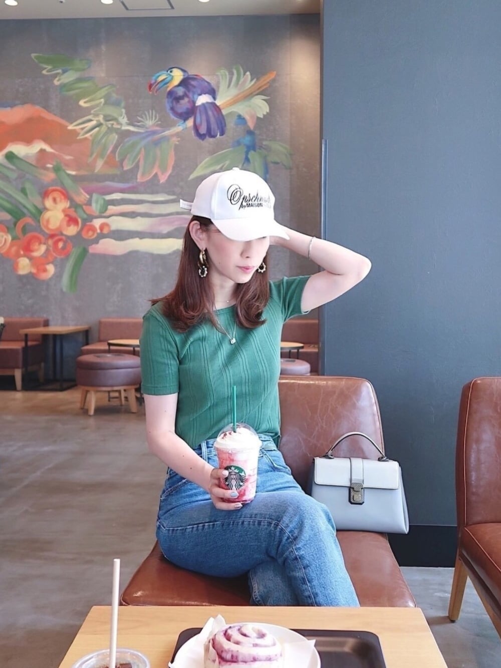 インスタも更新中💕 👉natsu_mmer💕 スタバでゆっくりするのが好き✨ キャップ×Tシャツ×デニムが楽チン🥰🥰 ラフなときはいつもの大ぶりアクセでアクセント😁😁 白のトップスばかり来てたから久々にグリーン☺️☺️